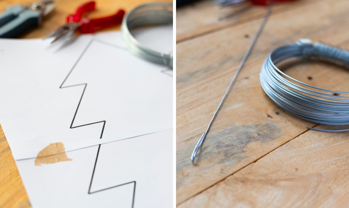 Prendete le pinze e avendo cura di mantenere il fil di ferro piatto sulla superficie, modellatelo in modo che segua la figura presente sul template. Ogni tanto aggiungete dei pezzetti di scotch, in questo modo sarà più stabile e seguirete meglio la forma.