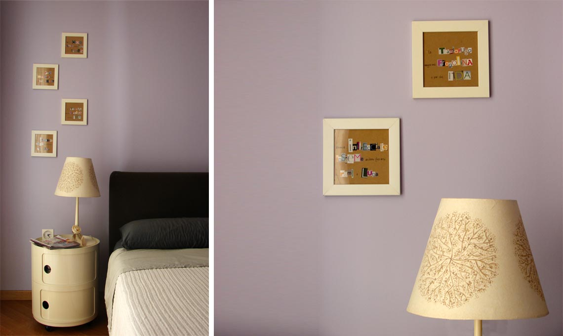 Puoi fare un solo grande poster, o tanti piccoli quadretti da comporre sulla parete. Puoi giocare con tinte molto forti e il bianco e nero, oppure puntare su uno sfondo neutro, come in questo caso, lasciando che siano le lettere a dare piccoli tocchi di colore.
