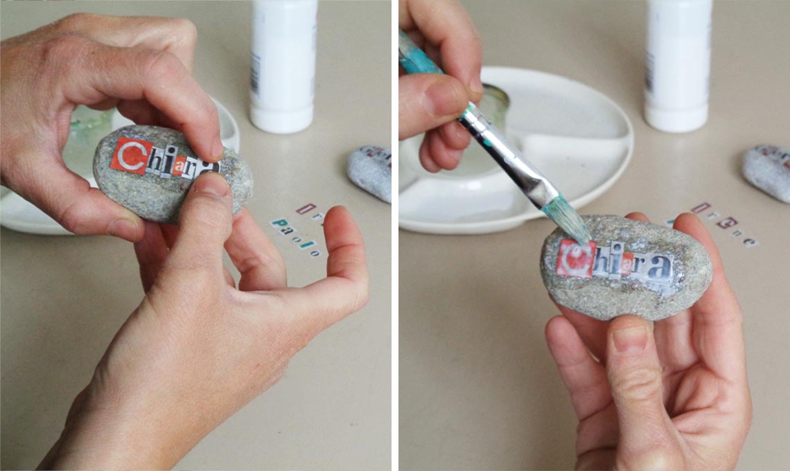 - Stendi con il pennello un po' di colla vinilica leggermente diluita sul sasso, e appoggia le varie lettere. A nome ultimato, stendi un ultimo strato di colla sopra il nome.