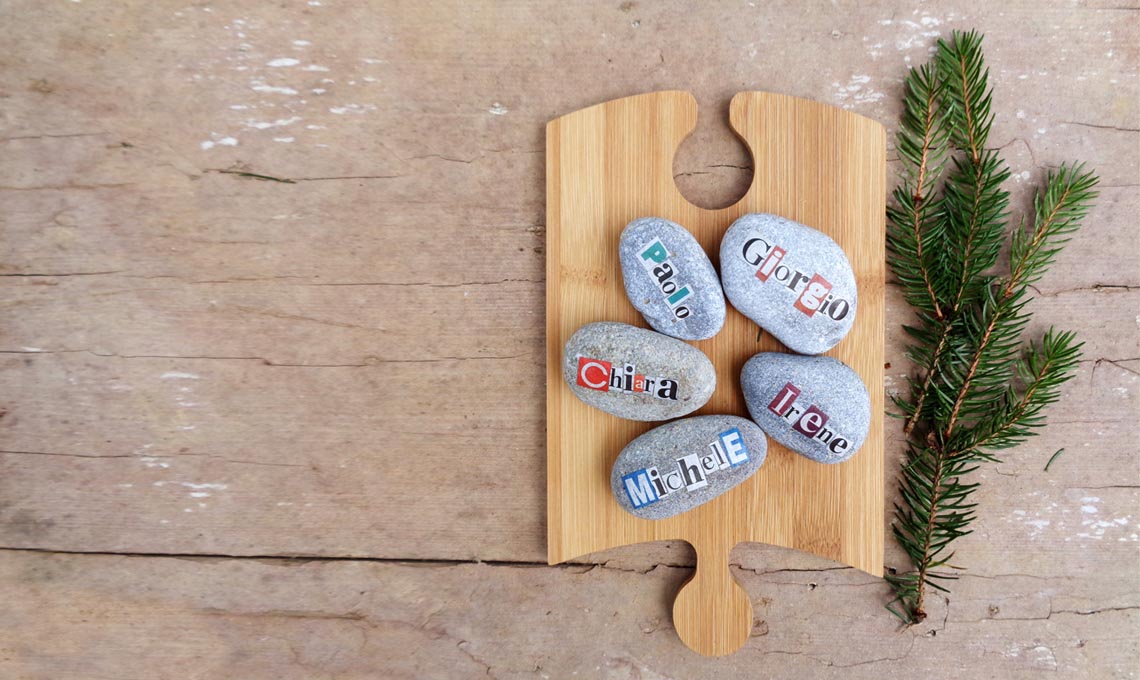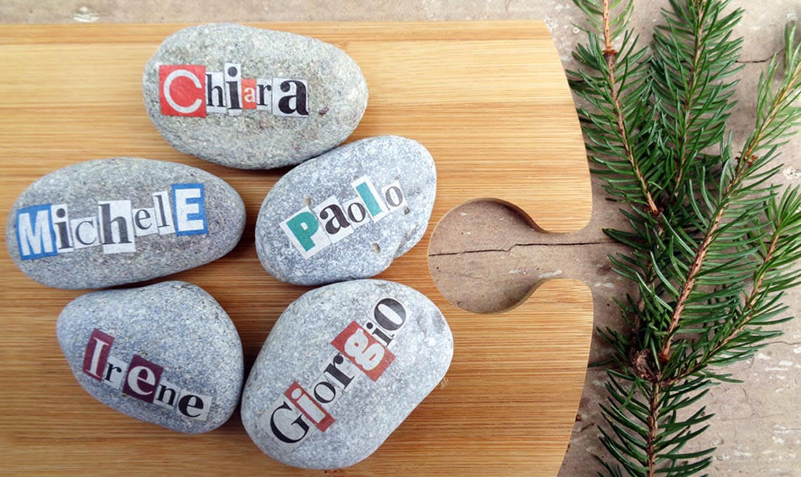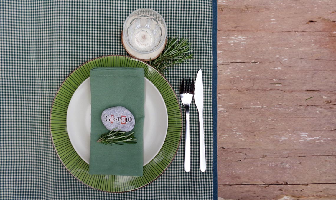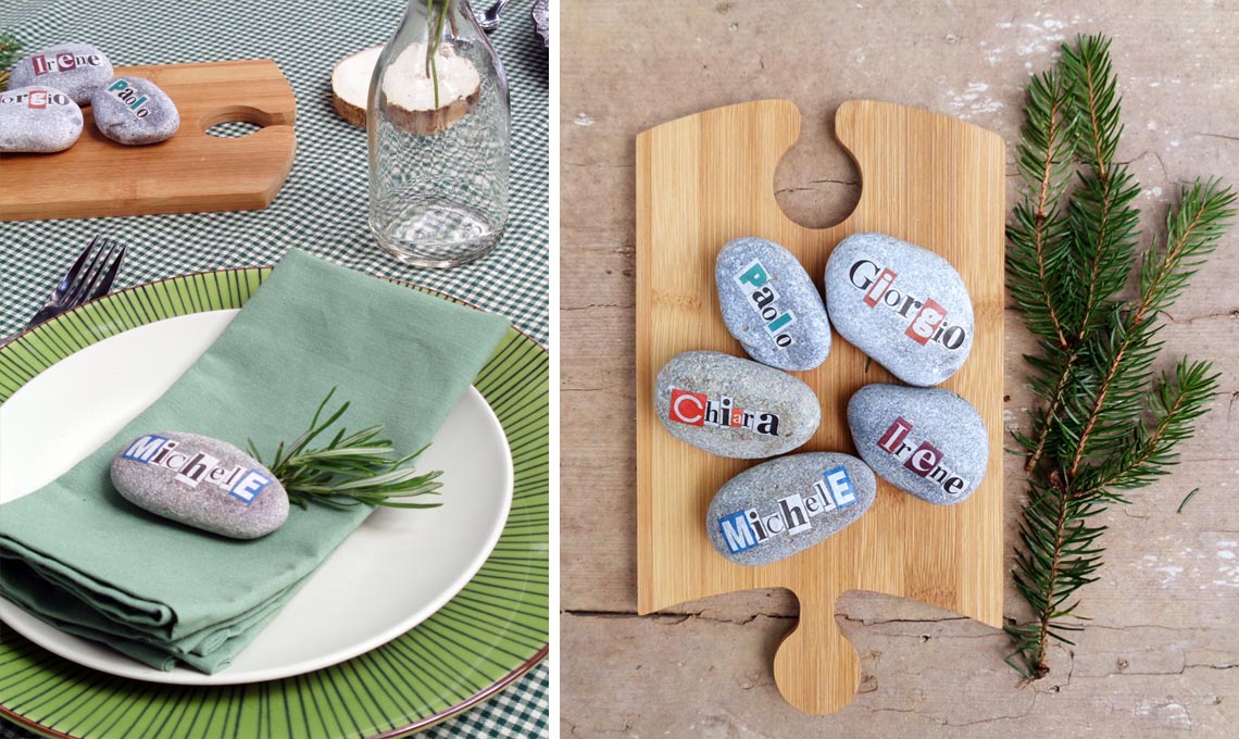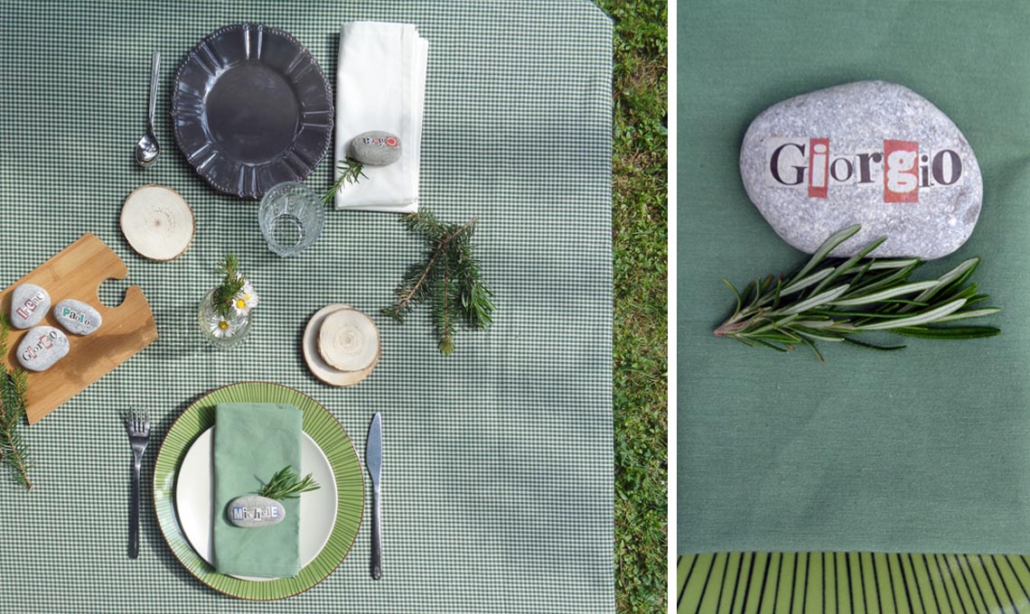 Nella loro semplicità, questi sassi segnaposto sono molto versatili: qui li ho posati su una mise en place dal sapore rustico e montano, accostandoli a una tovaglia a quadretti, elementi di legno e rami di rosmarino.