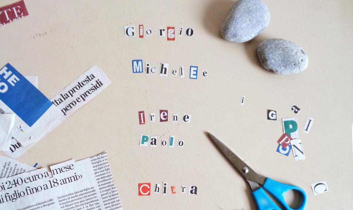 - Seleziona dai quotidiani le lettere che ti servono per comporre i nomi che vuoi scrivere. Divertiti a giocare con lettere maiuscole e minuscole, con diversi caratteri tipografici, e inserendo qualche tocco di colore.
