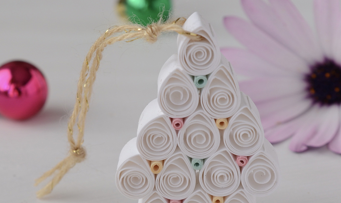 - Ritaglia con la taglierina, o altrimenti con taglierino e squadra, 13 strisce di cartoncino bianco lunghe 16 cm e larghe 1 cm. Arrotolale, con l’aiuto dello stecchino, fino a farne un rotolino serrato.