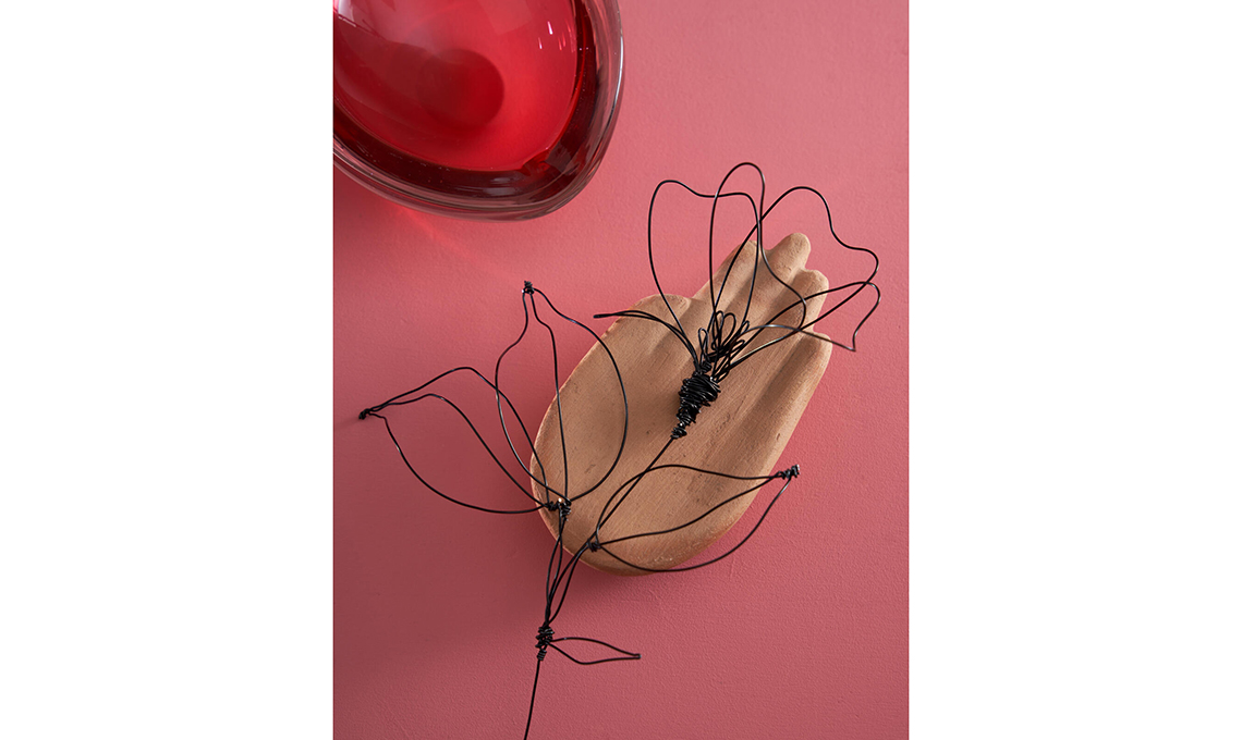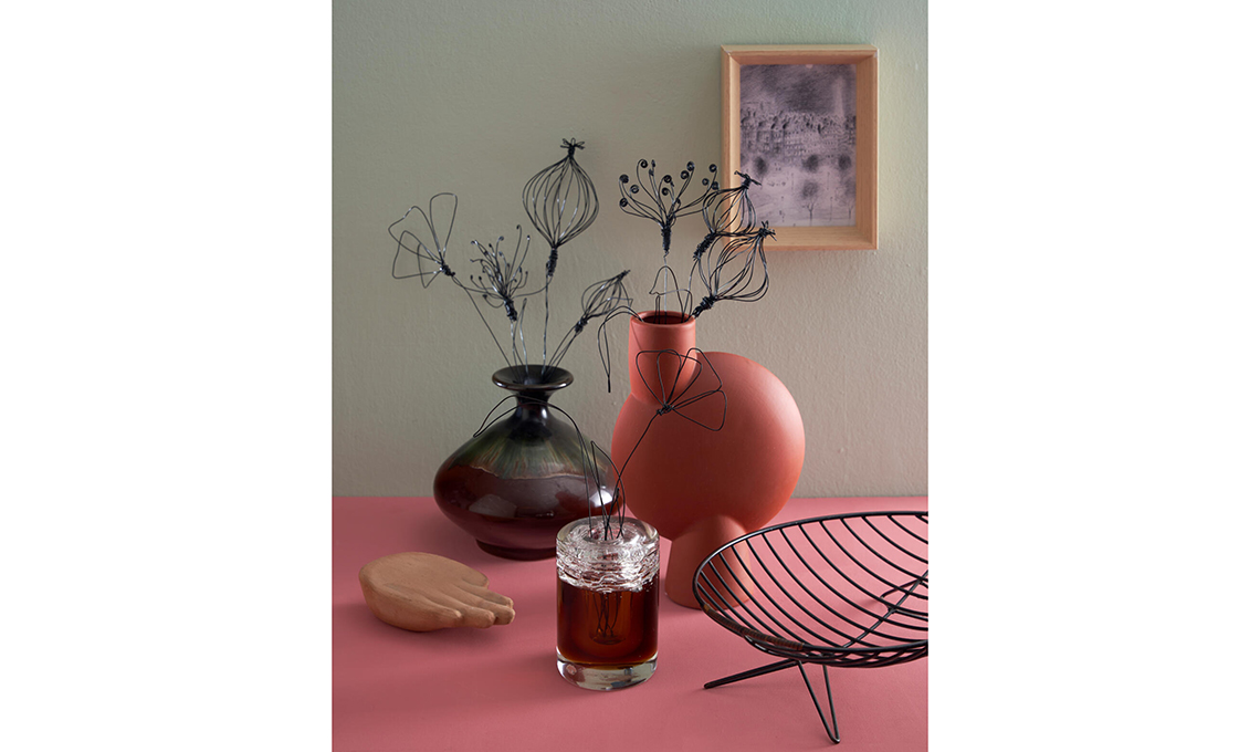 Vaso Sphere Bubl terracotta [101 Copenhagen, da Arcarreda], vasi vintage e vassoio di ferro [Mauro Bolognesi], mano in terracotta [I Fiori nella rete].