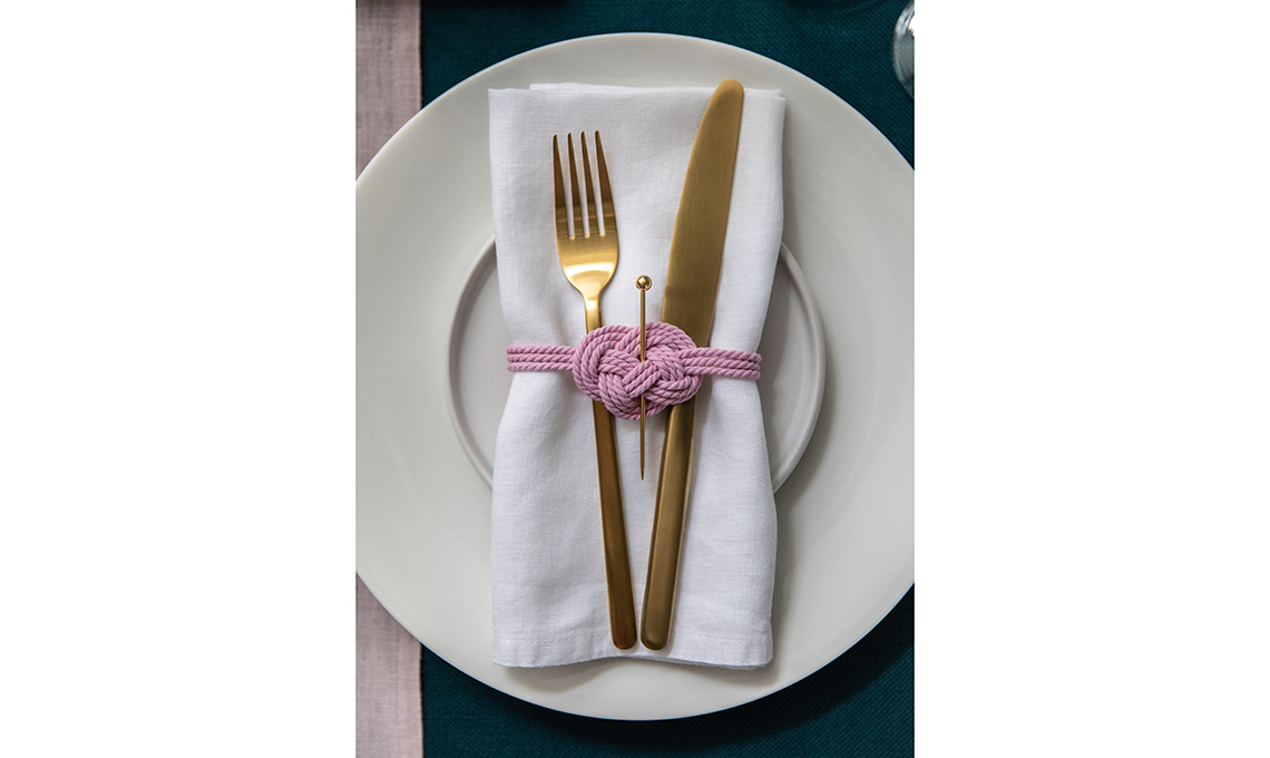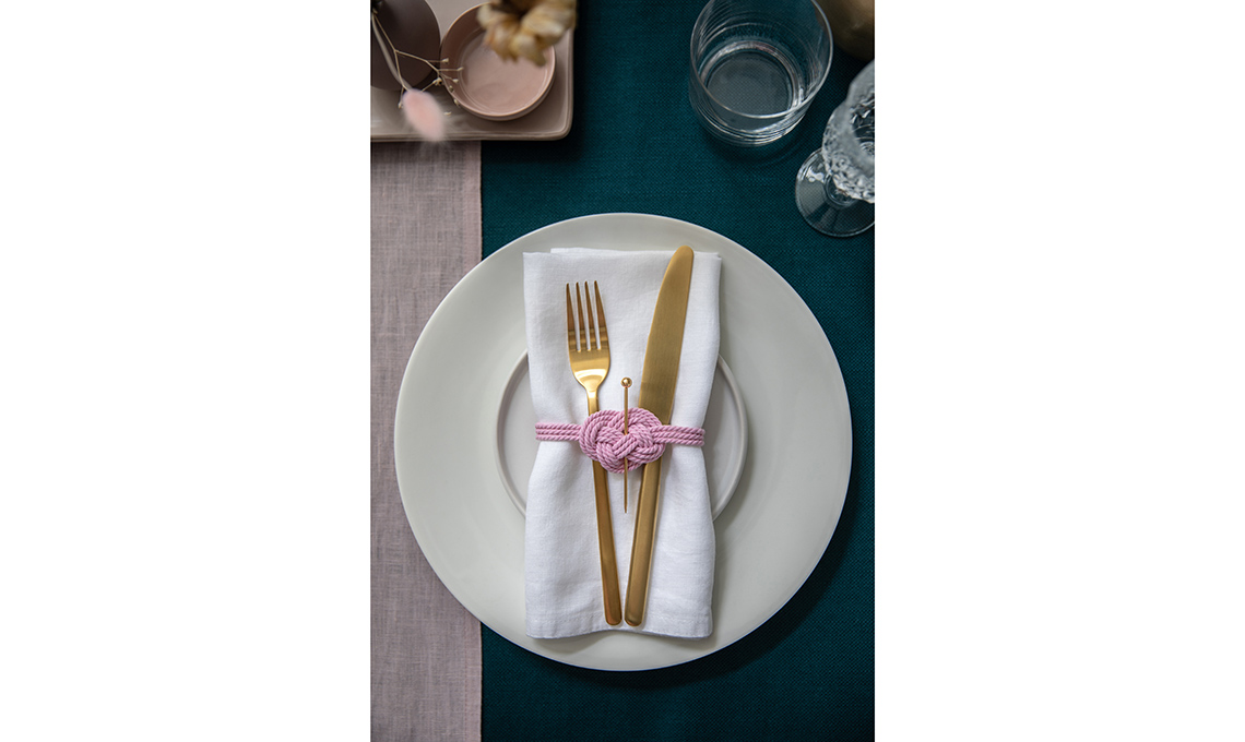 - Il fermatovagliolo è realizzato con il nodo fatto con 3 fili di cordoncino rosa. Il nodo Giuseppina lega il tovagliolo come un embrasse.
