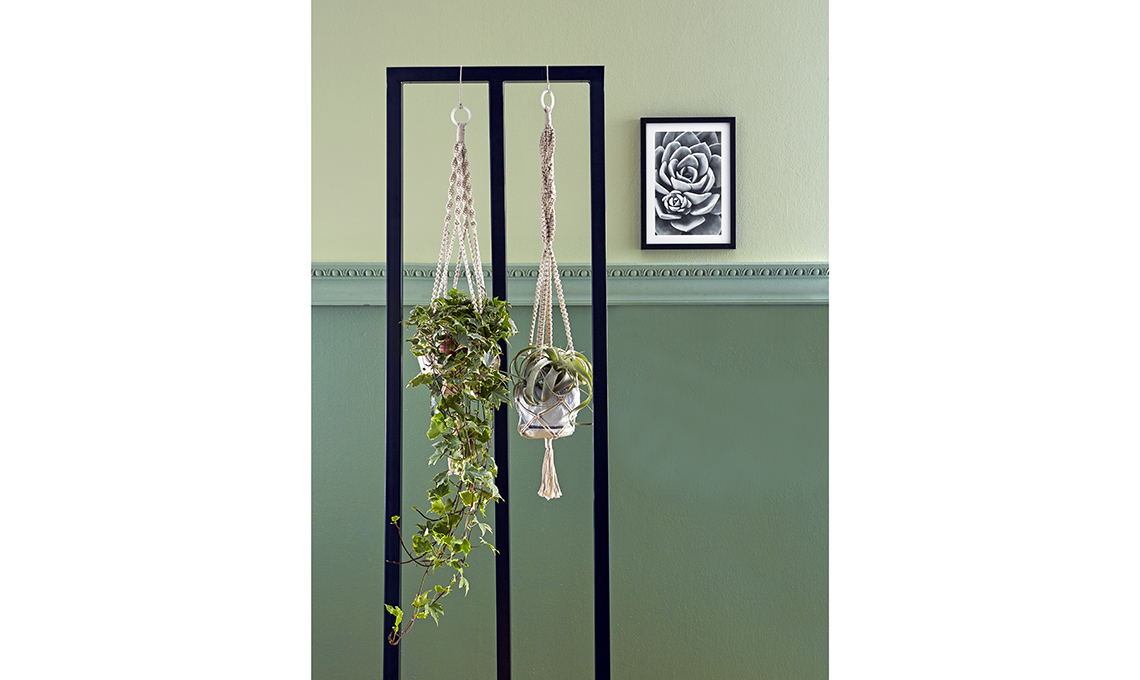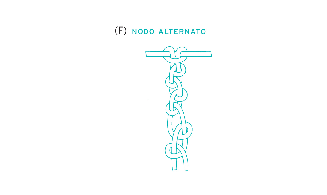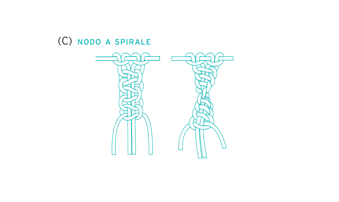 - Lavora con 4 fili annodati con 40 nodi a spirale (schema C). Prosegui allo stesso modo con gli altri 3 gruppi di 4 fili. Dividi i fili due a due e annodali per 20 cm con nodi semplici alternati (schema F). Unisci i 4 fili con un nodo piatto (schema B).