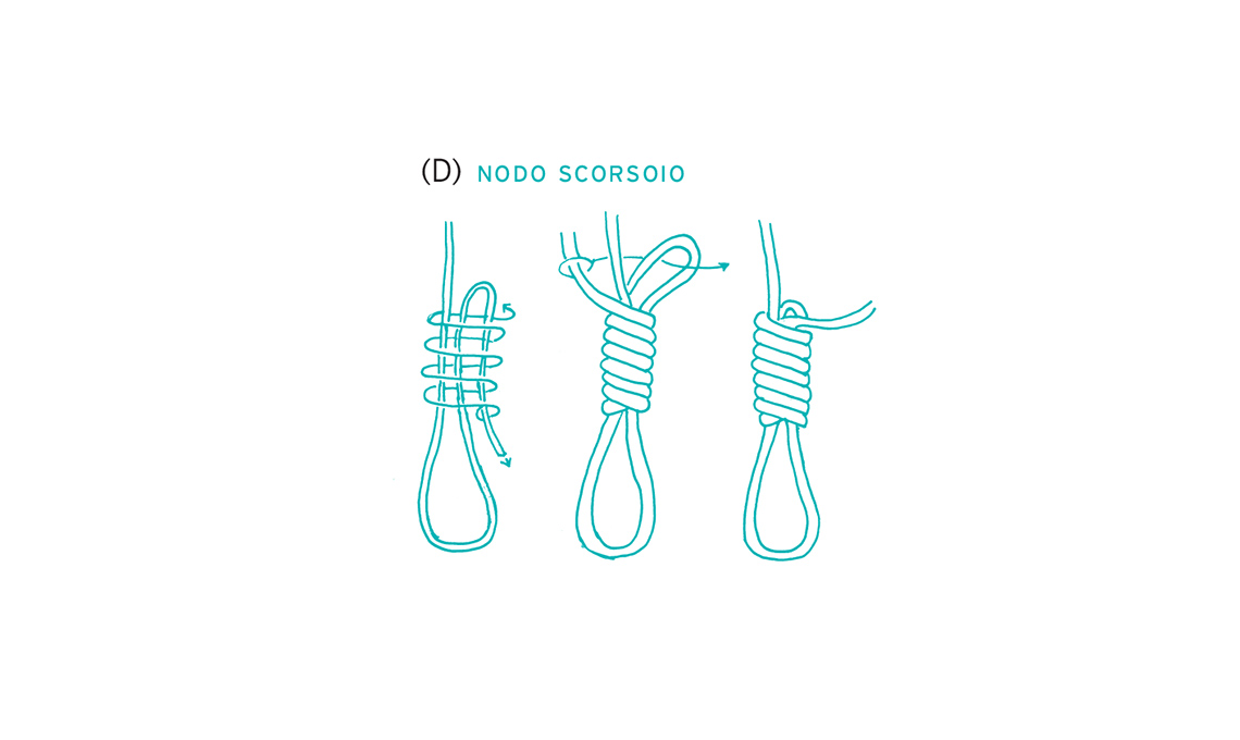 - A cm 8 dividi i fili e realizza 1 nodo piatto alternato (schema E). Ripeti lo scambio a 5 cm. A 3 cm riunisci i fili con un nodo scorsoio. Taglia i fili a 20 cm e termina con un nodino su ogni filo.