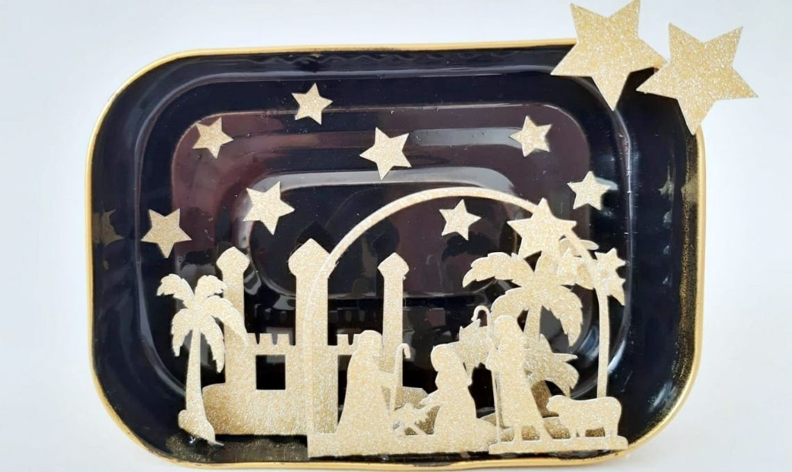 piegare lungo la linea tratteggiata le sagome della Sacra Famiglia, della città, del pastore e delle palme. - Incollare le sagome con la colla a caldo su uno dei lati lunghi della scatoletta.