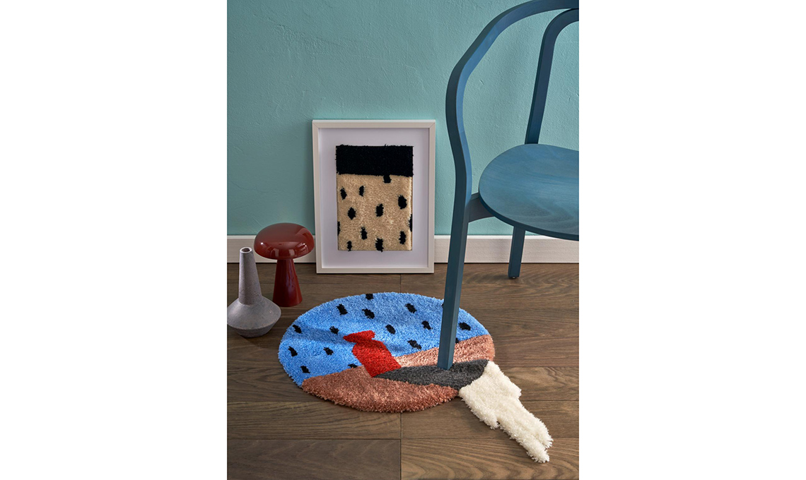 Sedia Evoque [Miniforms, da Arcarreda]. lampada portatile Como [&Tradition, da Design Republic]. vaso Federica Bubani [da Nap Atelier]. I filati utilizzati per gli arazzi e i tappeti sono Filato PERFETTO 100% acrilico [Mez Cucirini Italy].