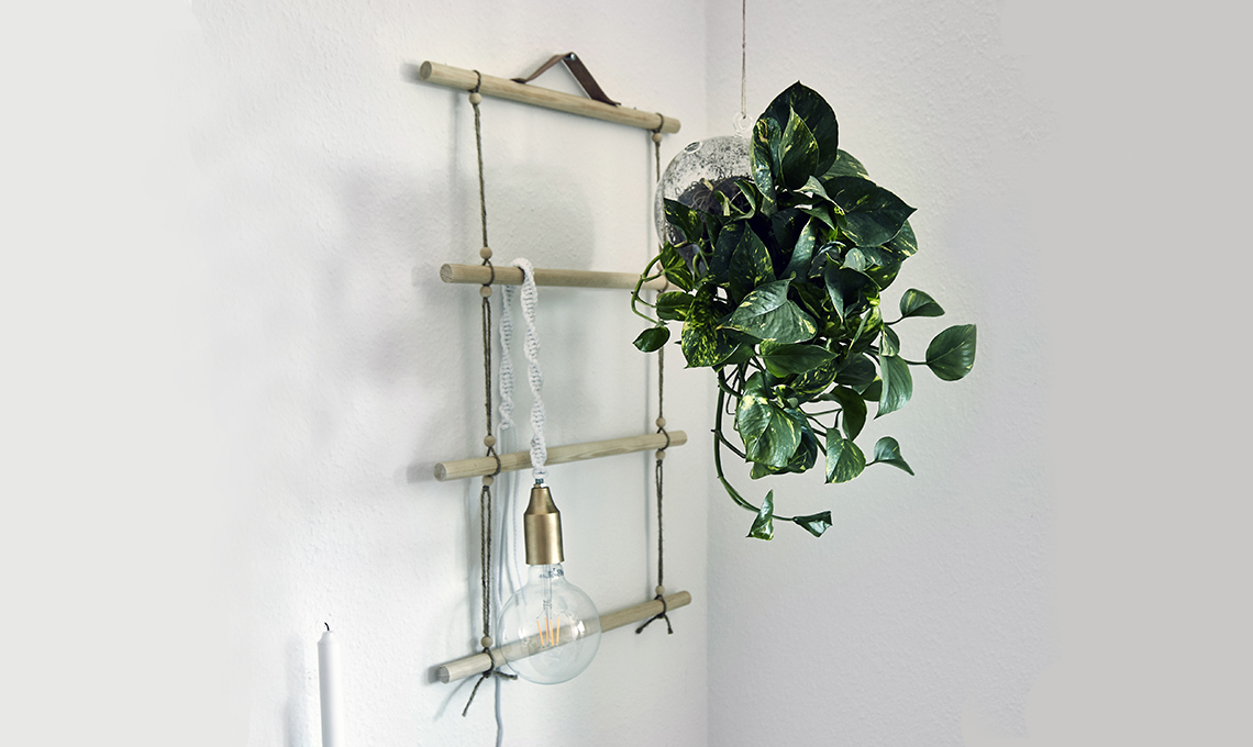 - Infila una sfera di legno e fermala con la colla. Lascia 20 cm, infila una sfera, un bastone tra i cordoncini e fissalo con un’altra sfera. Prosegui e fissa l’ultimo bastone con un doppio nodo.