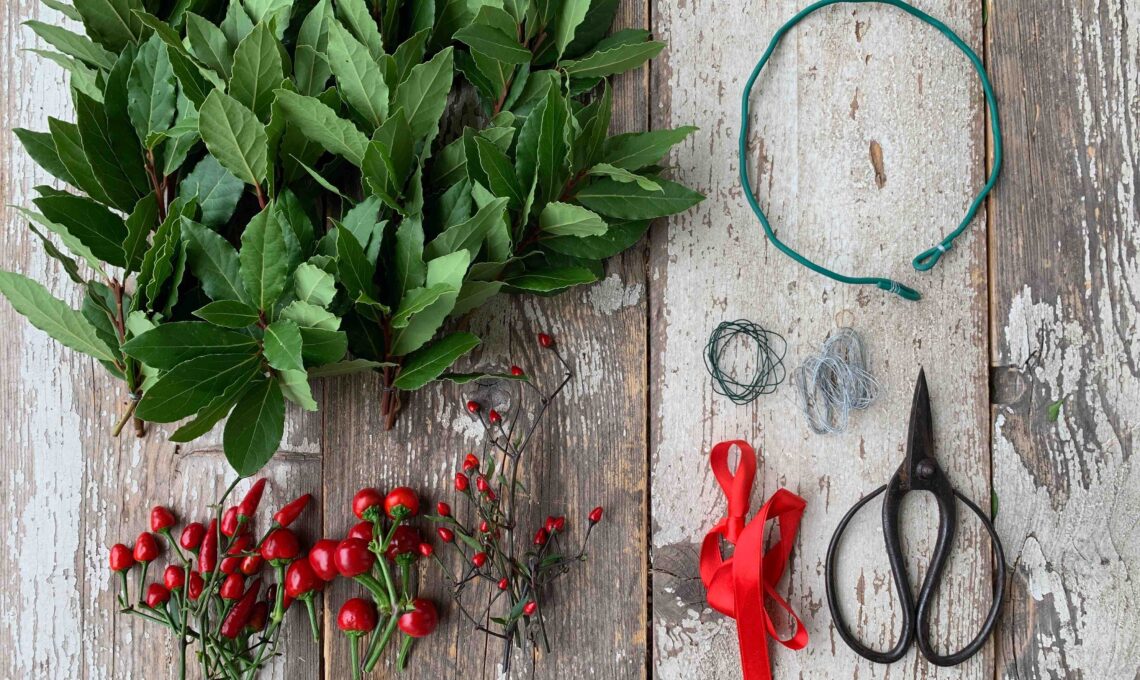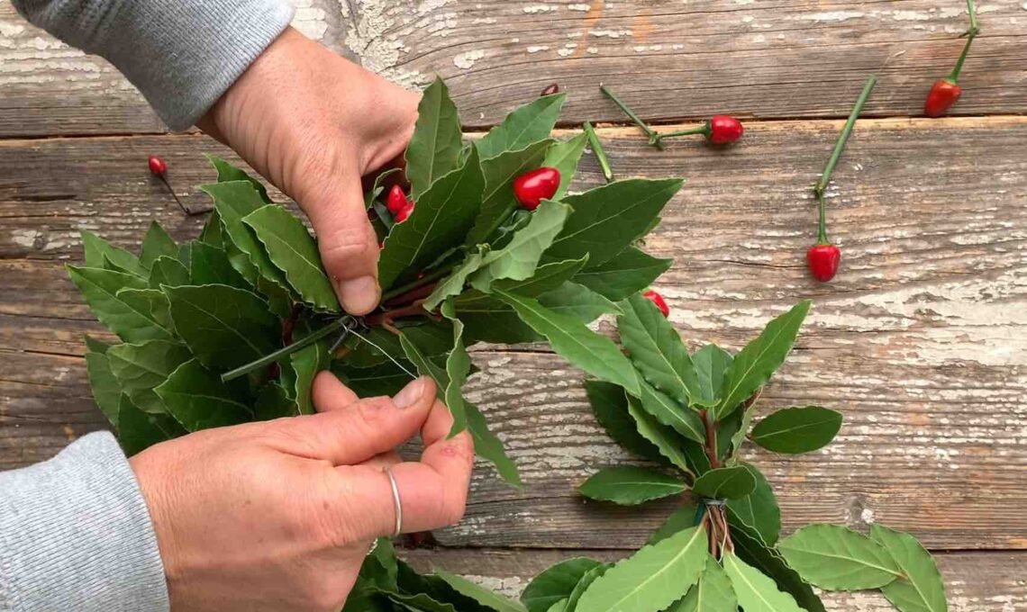 - Taglia e prepara piccoli mazzolini di alloro: ne occorrono circa 20, assemblati con tre rametti ognuno.