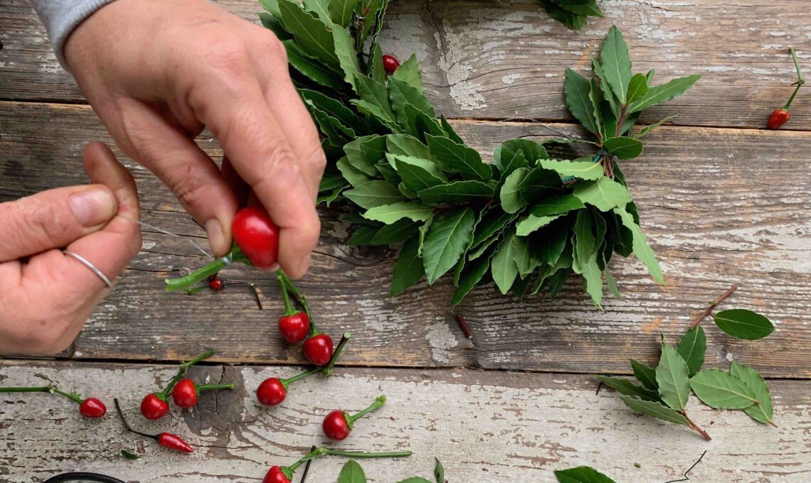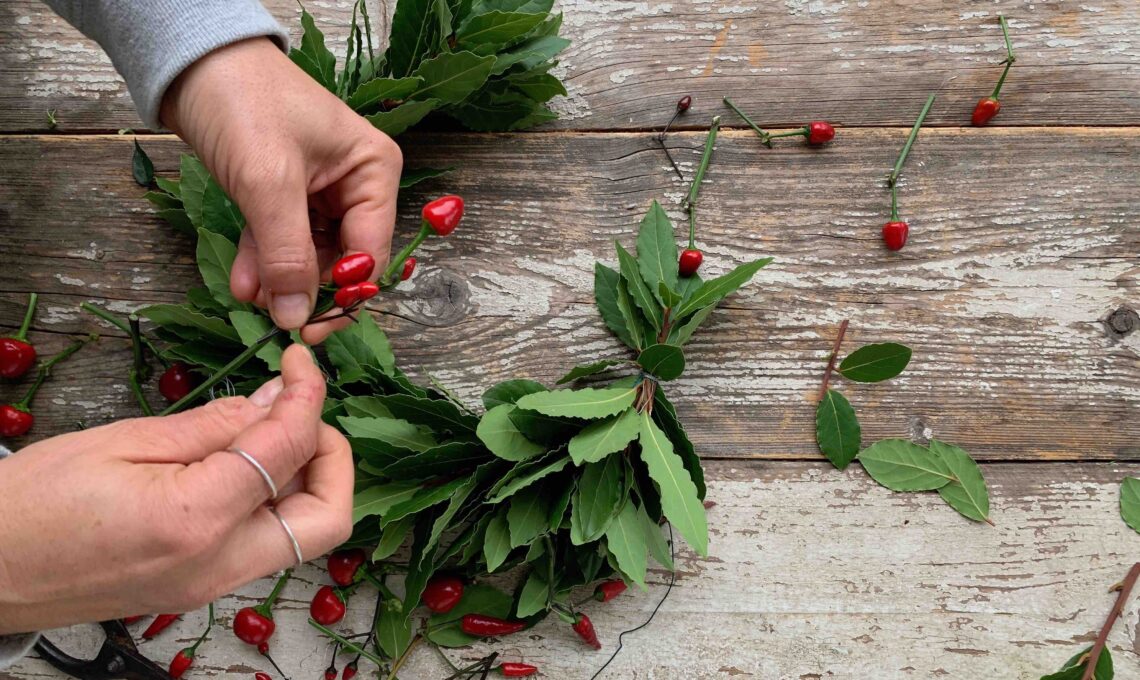 - Prepara le bacche di peperoncino, crea un’anima e con lo stesso metodo, introduci il peperoncino alternandolo all’alloro