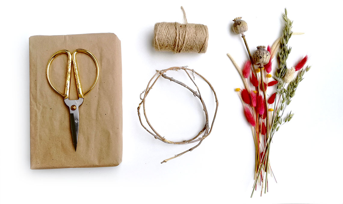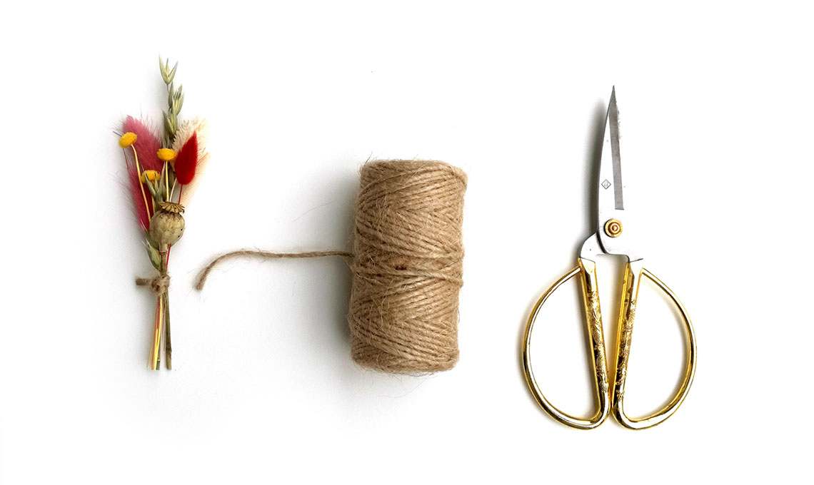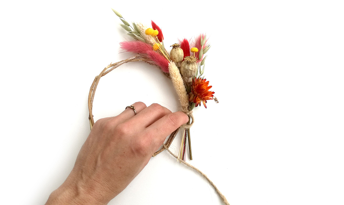 - Forma piccoli mazzetti con i fiori secchi e chiudili con lo spago. Lega i mazzetti alla base sovrapponendoli leggermente: puoi ricoprire tutta la superficie o solo un lato.