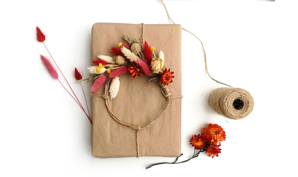 - Lega le estremità della ghirlanda con lo spago e utilizza la tua creazione come chiudi pacco per i tuoi regali.