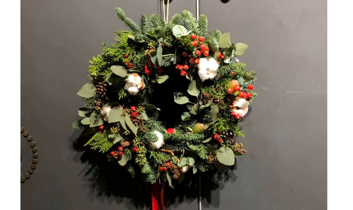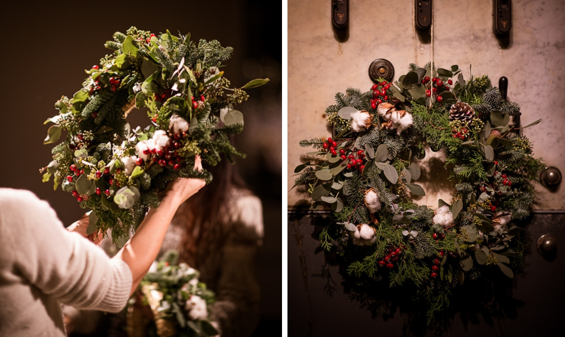 - Cerca di rimanere sempre al centro della ghirlanda e, una volta arrivata all’ultimo, taglia il filo di ferro lasciandolo lungo circa 10 cm. Chiudilo nella parte posteriore della ghirlanda.