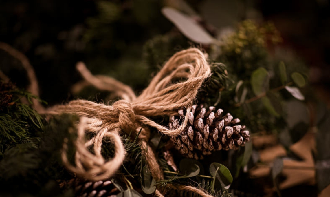 - Gira attorno alla ghirlanda lo spago per appenderla. Scegli il nastro e la decorazione natalizia (ciondoli, tags o un campanelli).