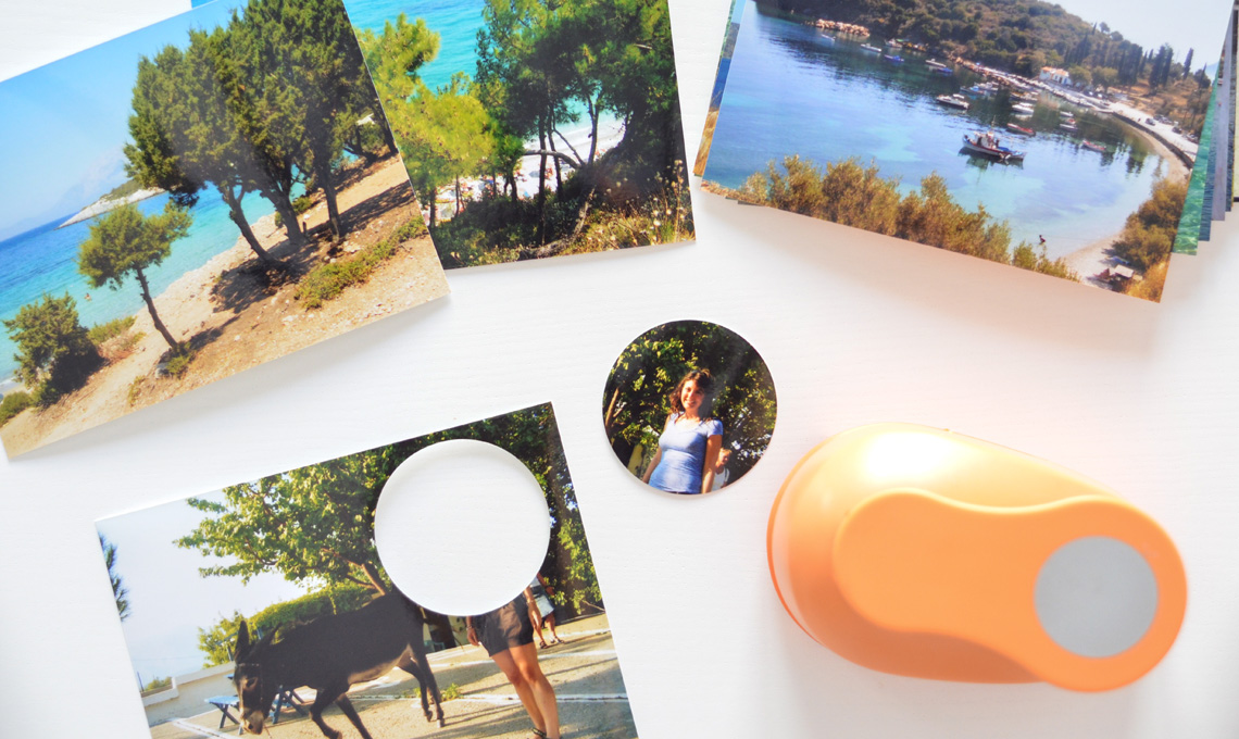 - Con l’aiuto del perforatore, ritaglia le foto in modo da ottenere tante piccole foto rotonde.