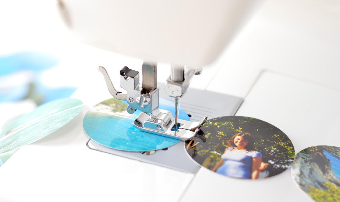 - Cuci i dischetti con la macchina da cucire, uno dopo l’altro, in modo da creare un festone. Fai attenzione a posizionare le foto rotonde ben allineate, una dopo l’altra. Se non hai la macchina da cucire, puoi incollare le foto una accanto all’altra lungo uno spago sottile.