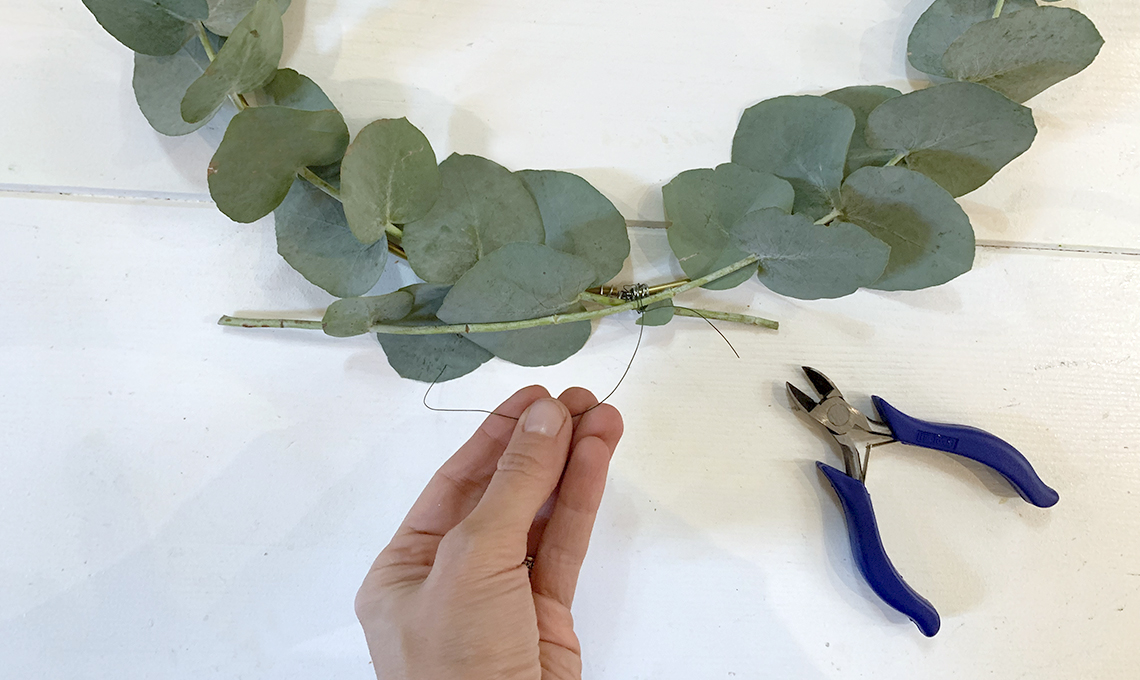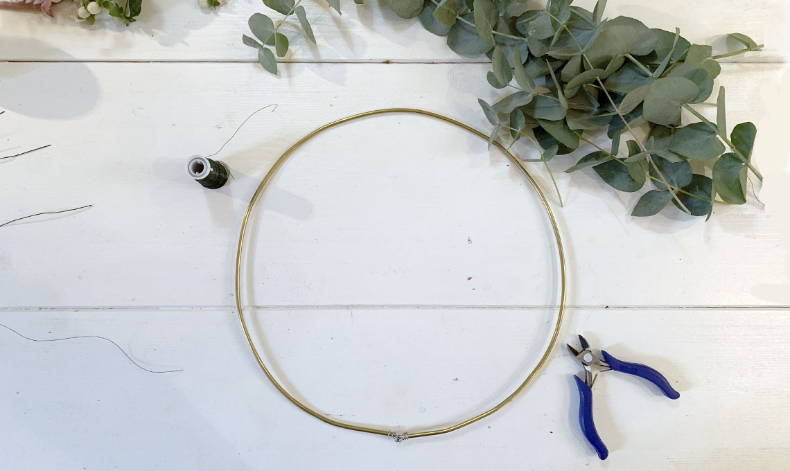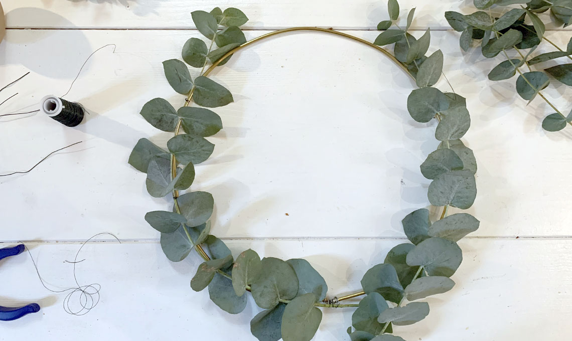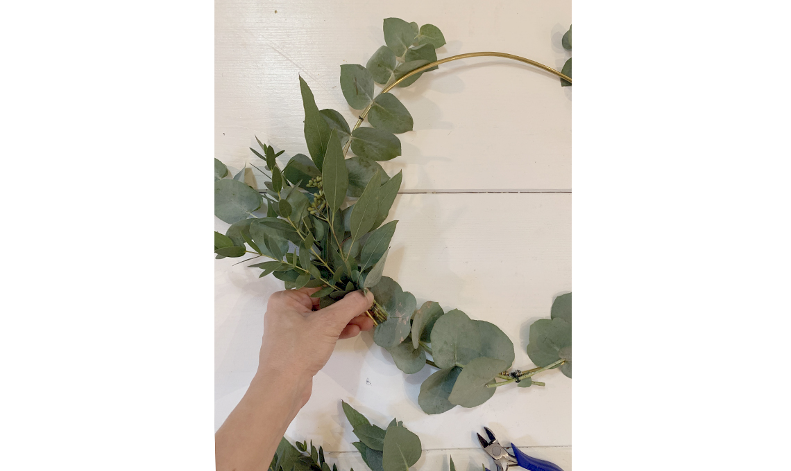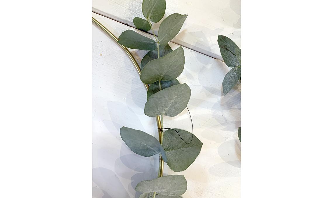 - Taglia due rami abbastanza lunghi di eucalyptus cinerea, serviranno per la base verde. La parte con la chiusura deve rimanere in basso e con il fil di ferro verde da fiorista fissa i rami al cerchio, uno a destra e uno a sinistra.