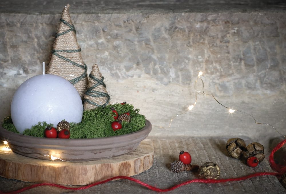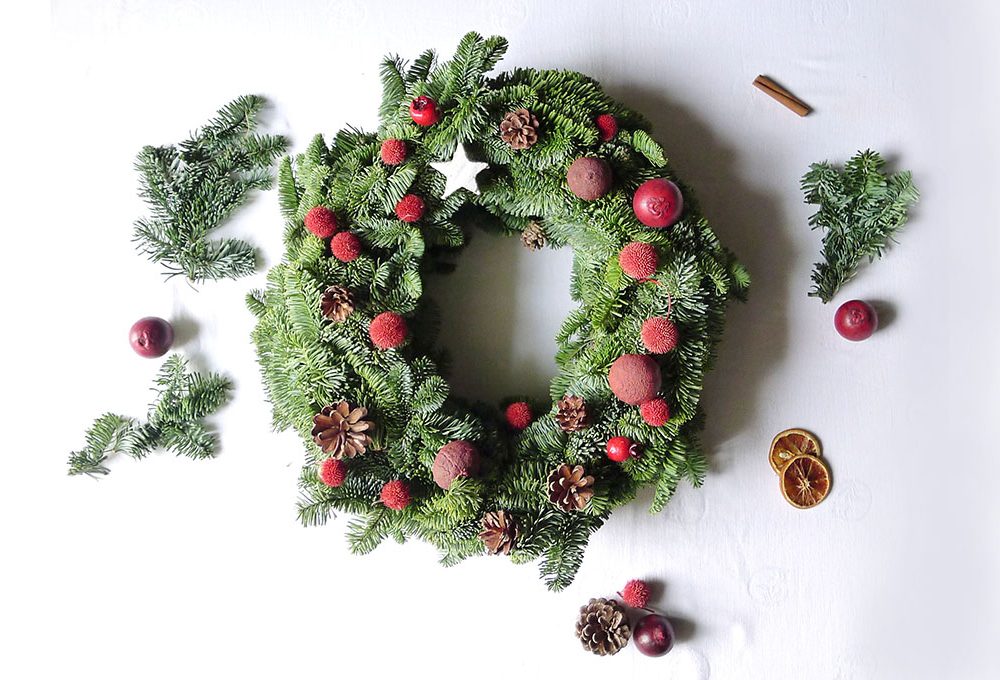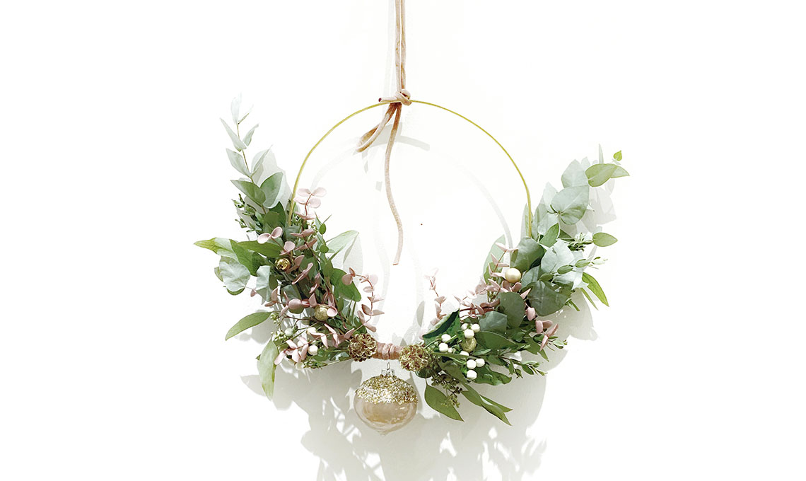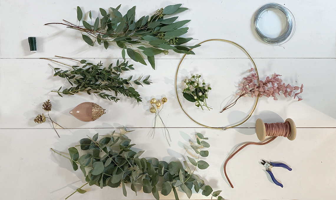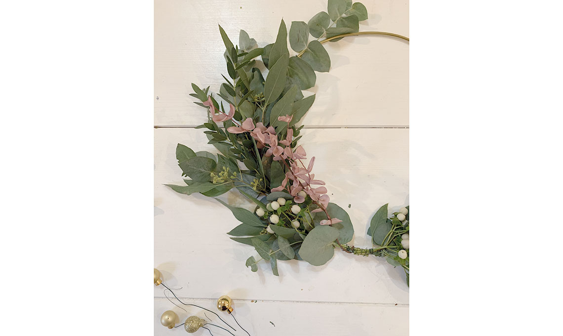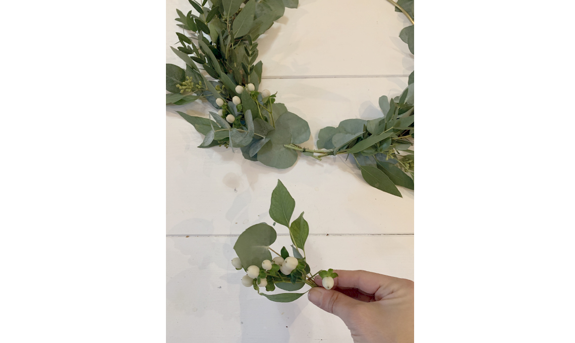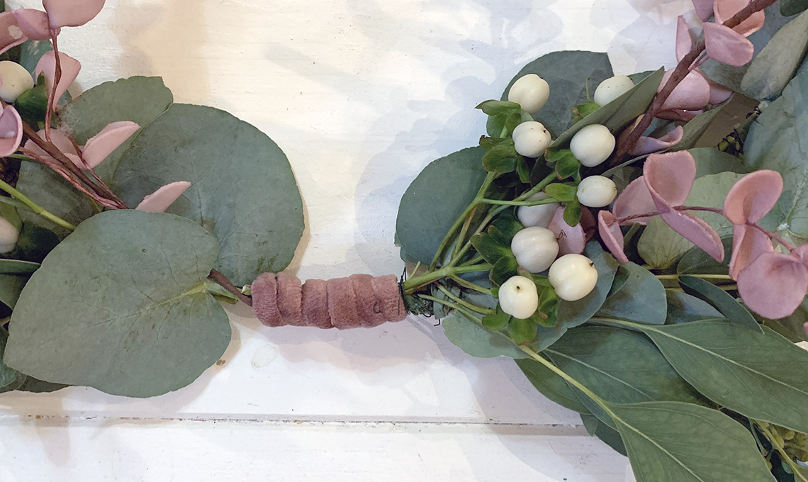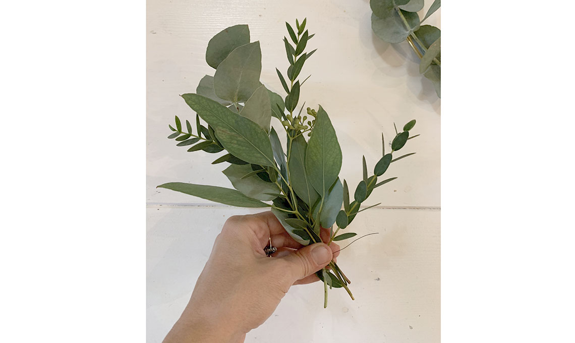 - Realizza 4 mazzolini mixando i tre tipi di eucalyptus. Fissali partendo dal basso della ghirlanda (due a destra e due a sinistra).