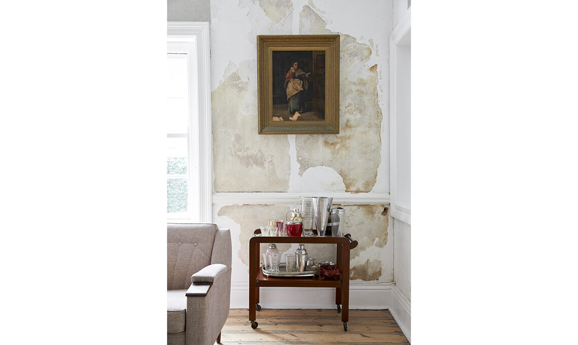 Una scelta décor interessante per mantenere visibile la storia di una parete, con le tracce di vecchia pittura o carta da parati.