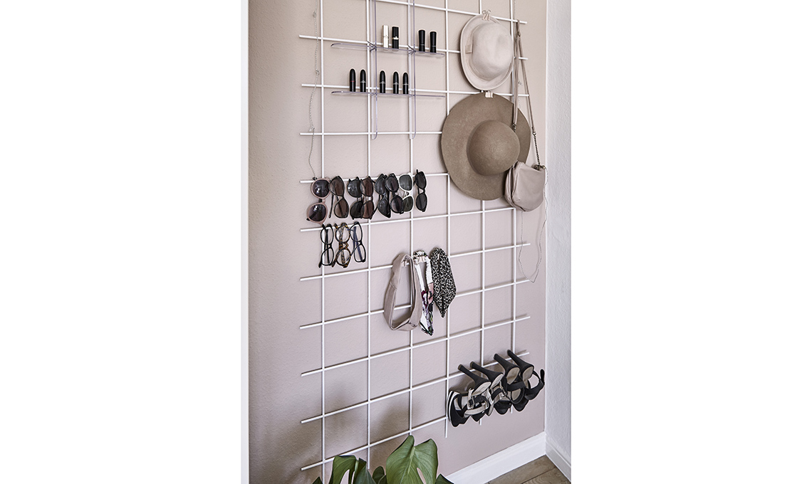 - Con le viti e i tasselli fissa la rete alla parete, quindi appendi i ganci.