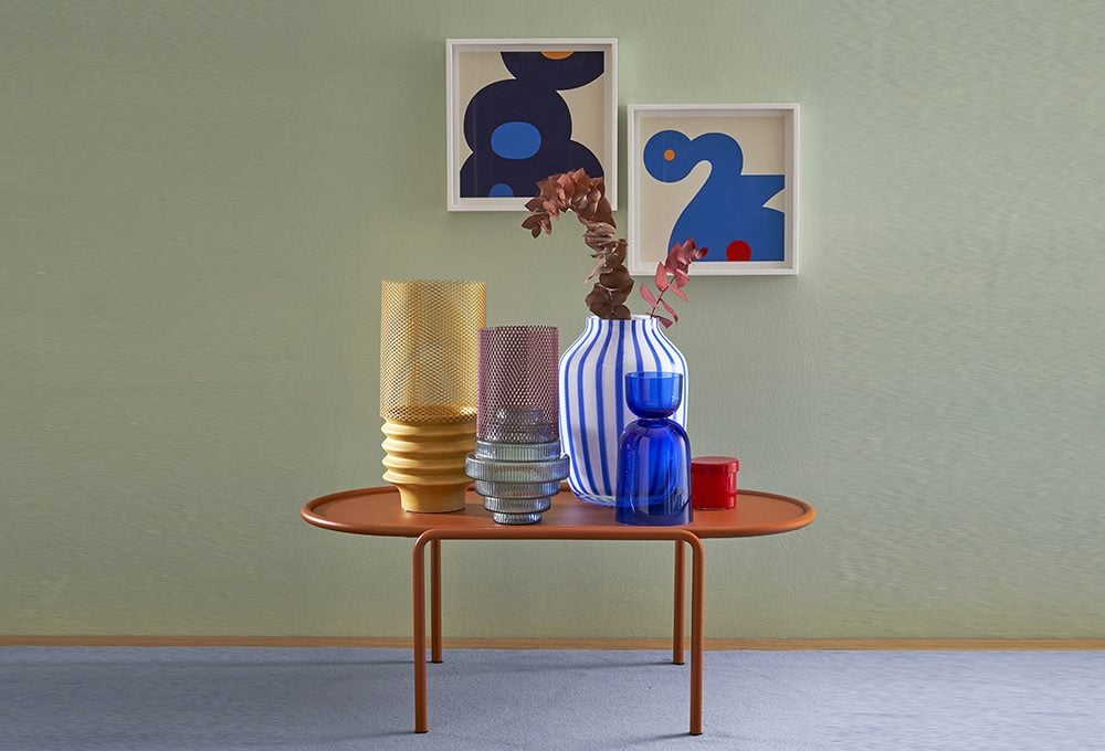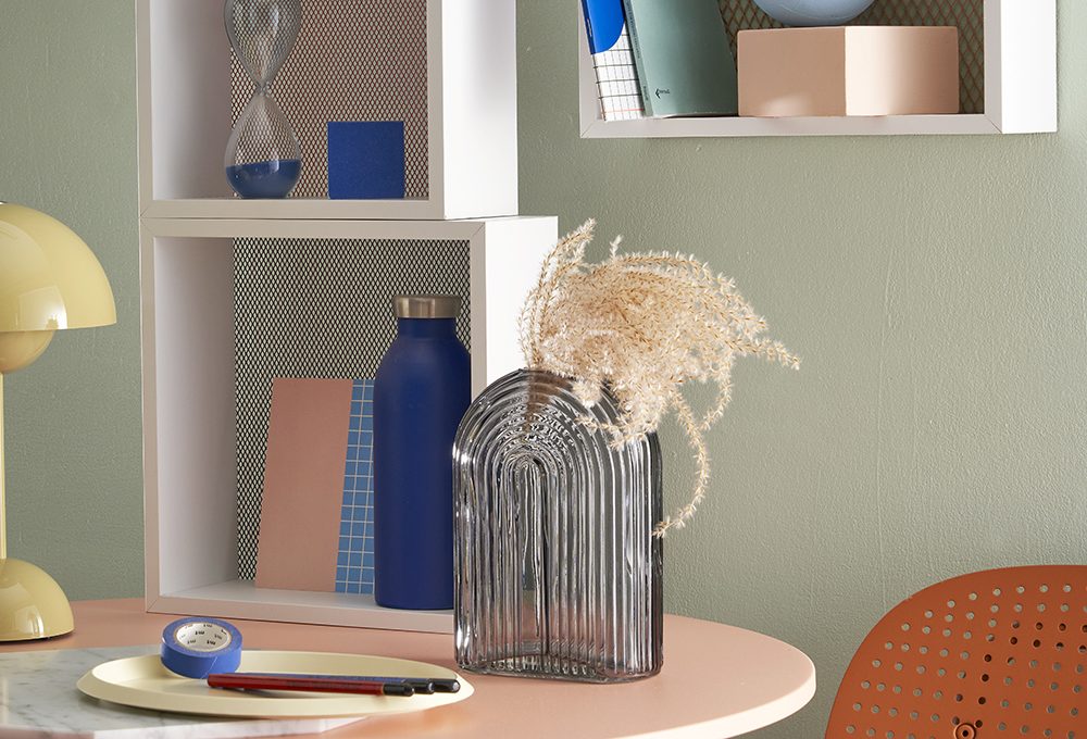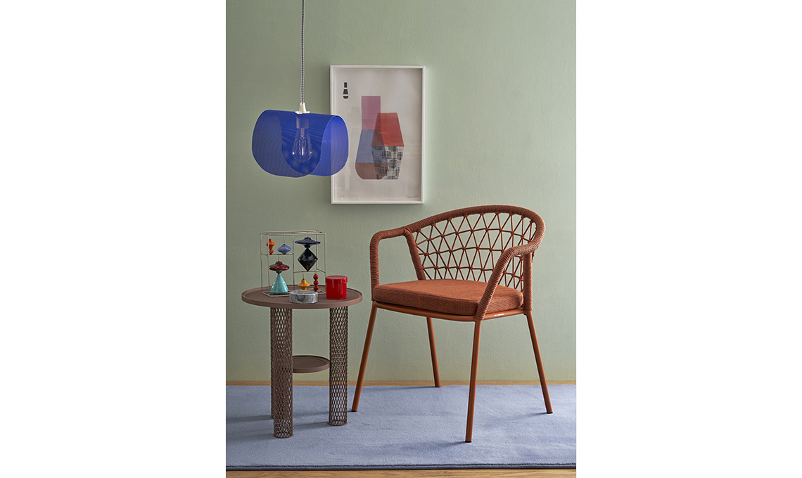 Poltroncina Panarea 3675 colore terracotta, con intreccio artigianale in corda di polipropilene [Pedrali]. Tavolino Net in rete di acciaio verniciato colore blush [Moroso]. Appoggiati: scultura a elementi mobili in ceramica e acciaio, opera di Luigi Belli [Galleria L’Affiche], scatolina Container in vetro rosso [Design Republic], fermacarte