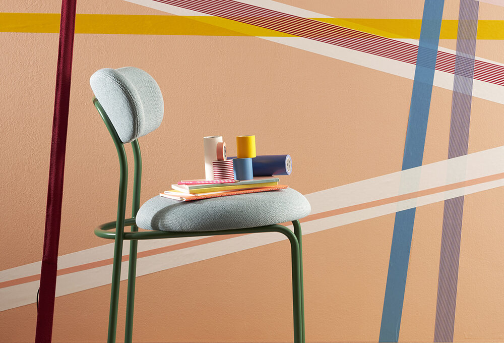 Sul tavolino rotondo in metallo verniciato con gamba a cono [Nap Atelier, ø cm 60x56h € 400], lampada da tavolo portatile Curiosity [Artemide, cm 18x15x36h € 295] e vaso décor Grey in vetro satinato [Nap Atelier, ø cm 23,5x42h € 118]. cornici e modanature in polistirene bianco [Leroy Merlin].