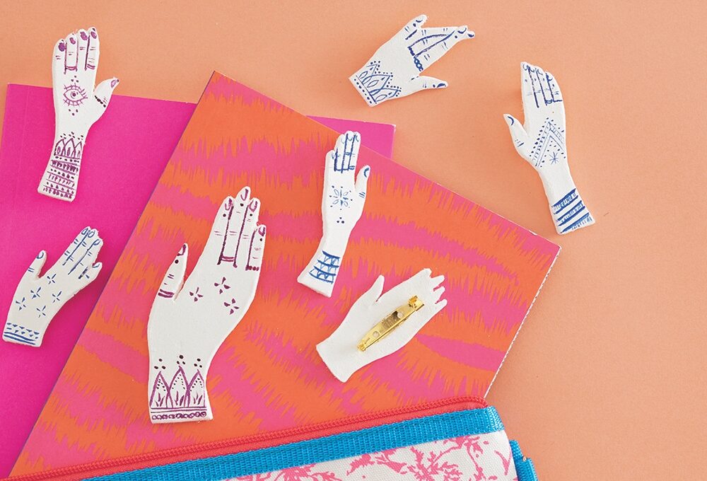 Sono in tessuto, imbottite e cucite a mano, realizzate stampandole su carta termoadesiva. Procedi così: scarica e stampa le immagini scelte sulla carta termoadesiva, ritagliale, poi fissale con il ferro da stiro sul tessuto. Quindi incolla dietro la base per spilla.