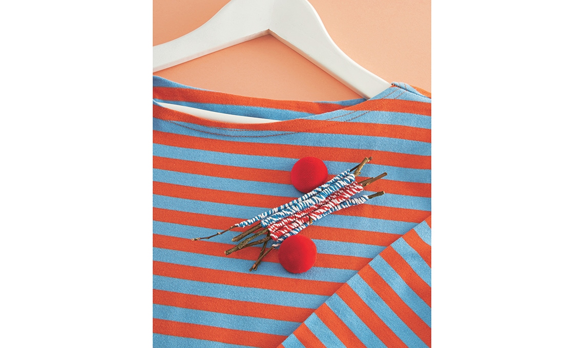 Con i cordoncini bicolore Bakers Twine (in vendita su Amazon) rivesti alcuni rametti di legno. Incollali tra loro, quindi fissa sul retro la base per la spilla. Incolla poi due basi piccole per spille sui bottoni di velluto e appuntali a tuo piacimento accanto ai rametti.