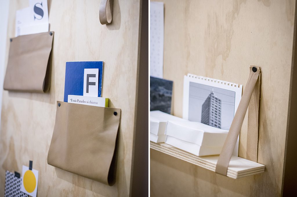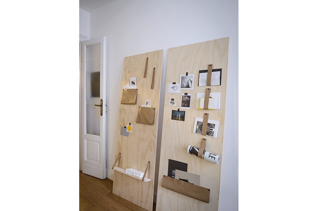 - Tasche. Ritaglia dei rettangoli in ecopelle da cm 25x40 e da cm 60x20; piegali in due e fissali ai pannelli con viti da legno.