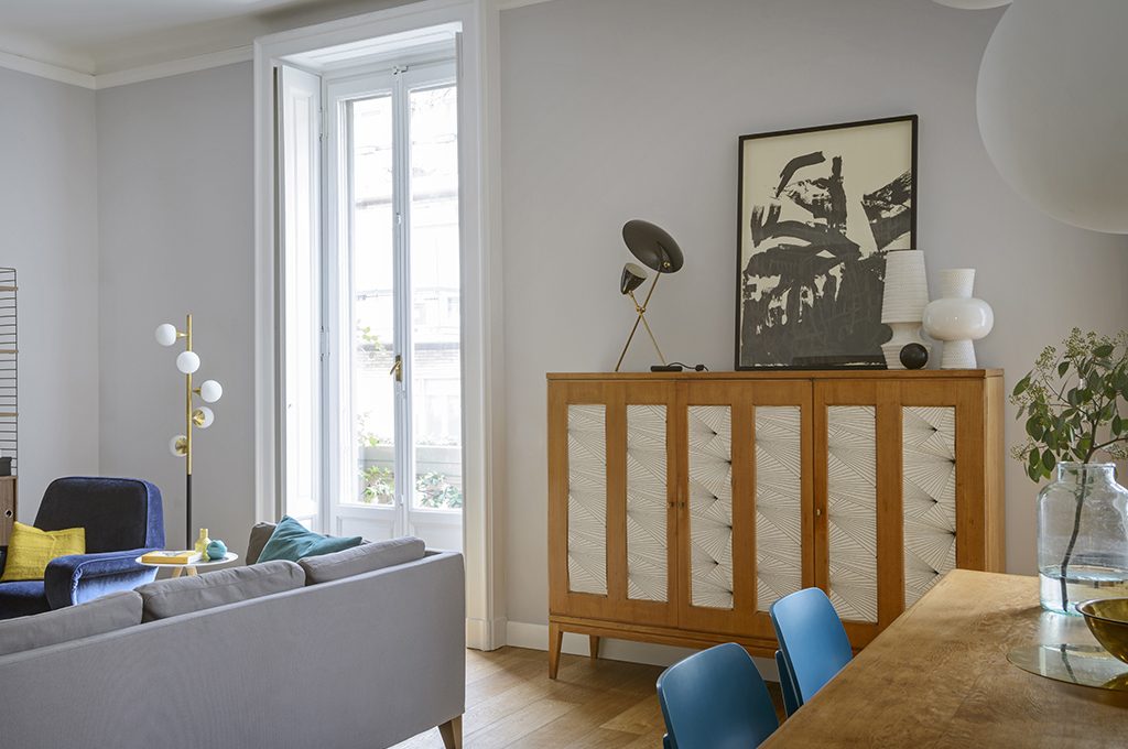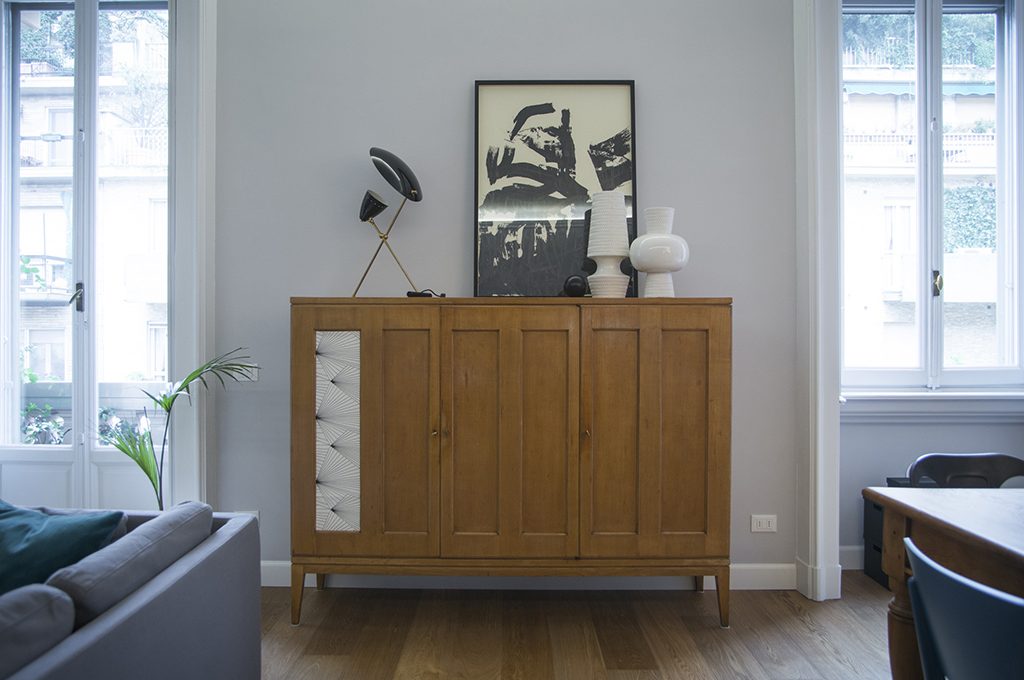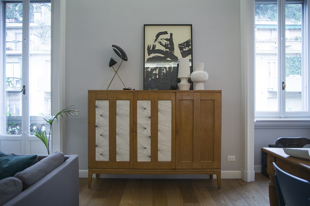 Per rinnovare un vecchio mobile con specchiature e cornici basta davvero poco: ti servono alcuni ritagli di carta da parati (magari la stessa che c’è nel locale) oppure del cartoncino decorato, poi nastro biadesivo o colla vinilica, squadre, matita e taglierino.