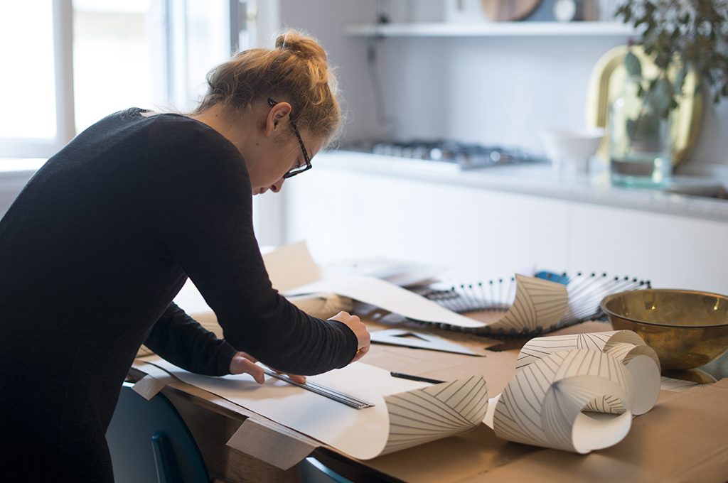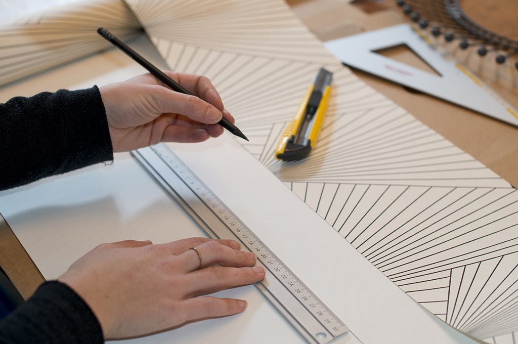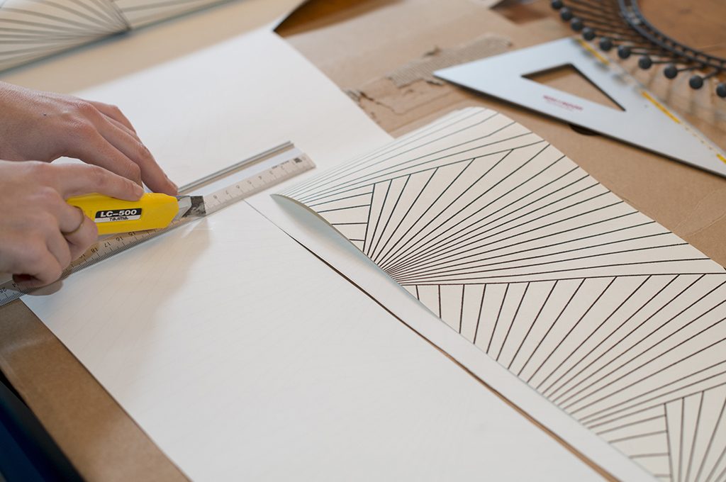- Taglia la carta. Misura le specchiature della madia e con il taglierino dalla tappezzeria crea dei rettangoli delle dimensioni giuste.