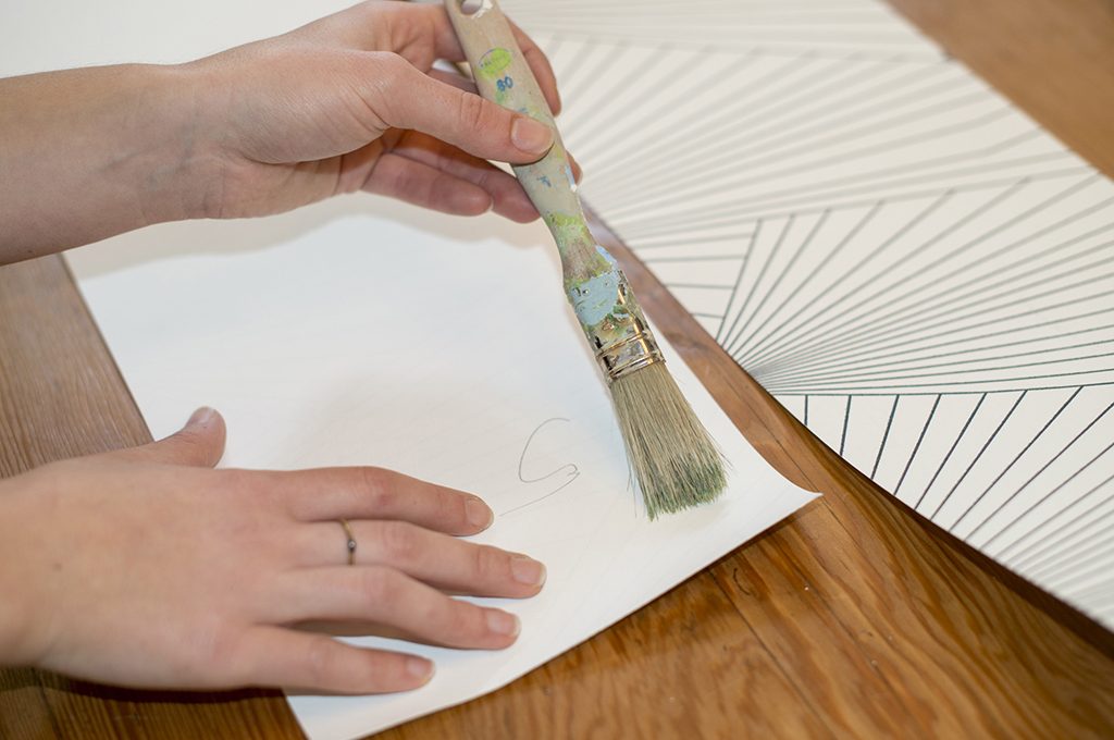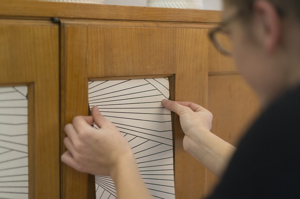 - Applica le strisce. Stendi sul retro della carta il nastro biadesivo e fissa ogni pannello alla madia, senza che si formino bolle.