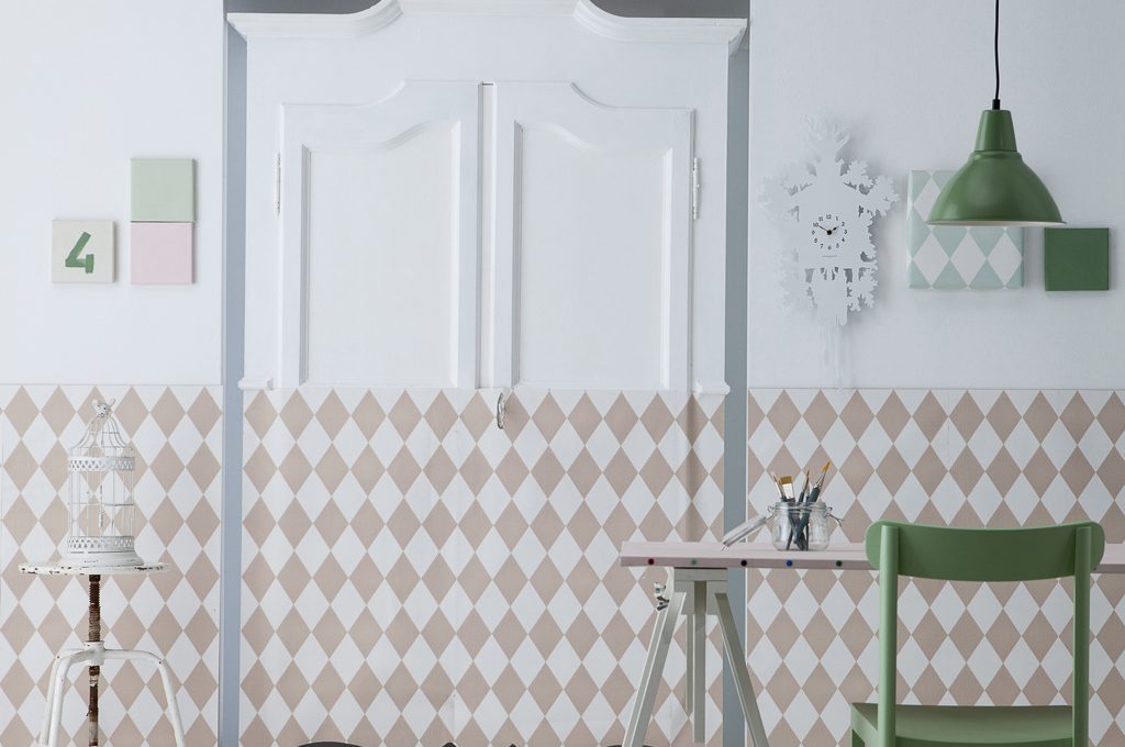 COME SI FA 1)Dipingi di bianco un vecchio armadio. Poi incolla, a parete e all’esterno delle ante, ad altezza boiserie la carta da parati (90-100 cm da terra). Questa tappezzeria a rombi è Harlequin, in tessuto-non-tessuto WallSmart (di Ferm Living su trend- house.it).