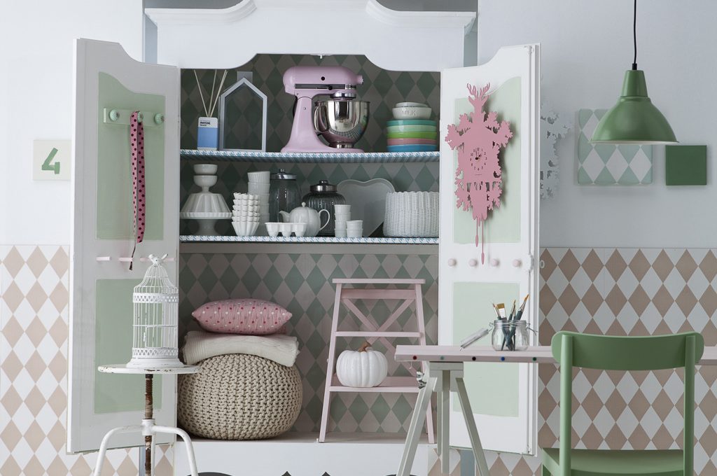 3) Non è finita qui: dipingi all’interno i riquadri sagomati delle ante con smalto in tinta, qui di To-Do Fleur; appendici pomoli, utensili...e un orologio a cucù! Lascia invece libero lo spazio in basso, per oggetti ingombranti come la scaletta (da dipingere di rosa o verde in tono).