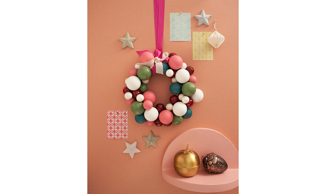 - Taglia un pezzo di filo di ferro, fallo passare nel gancio delle palline e infilale a testa in giù nella ghirlanda. Posiziona prima le palline più grandi, quindi quelle più piccole. Copri con le palline anche il bordo interno e quello esterno della ghirlanda.