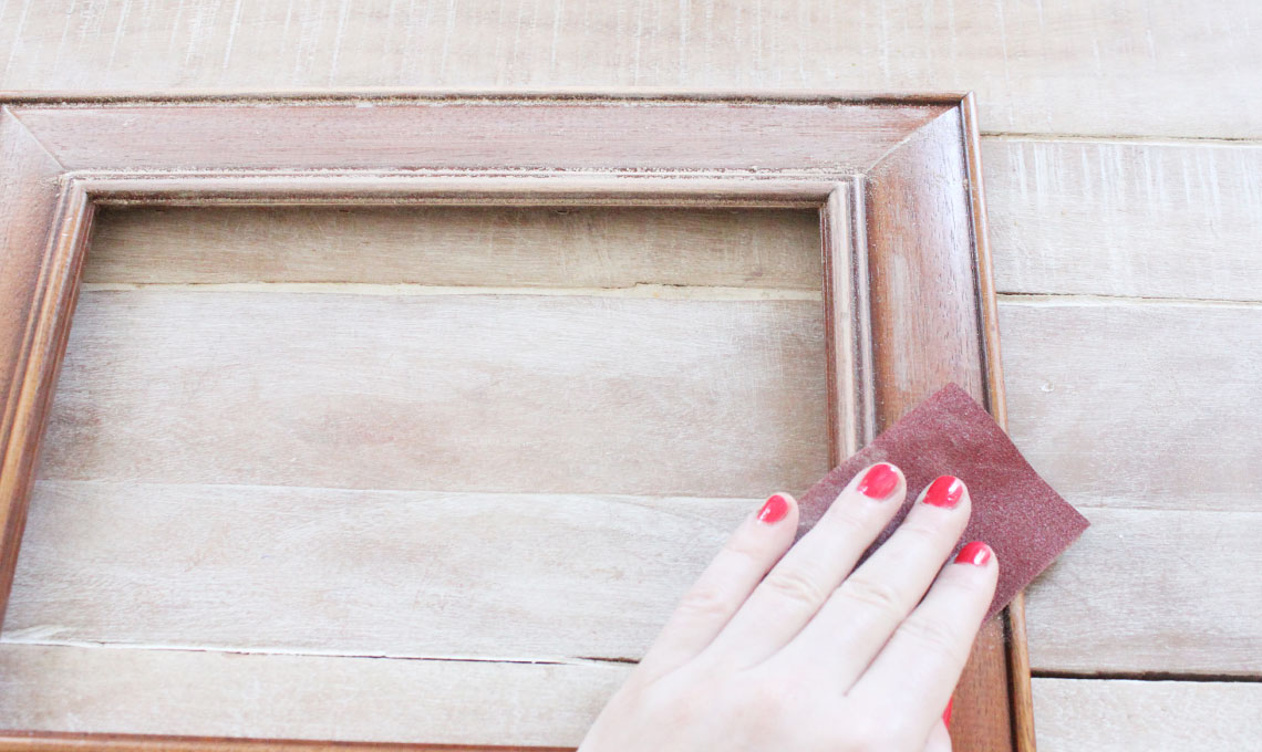 - Mentre asciuga il cartoncino, con la carta a vetro che hai utilizzato a inizio lavoro carteggia delicatamente la cornice su angoli e bordi per ricreare lo stile shabby. In questo modo il colore naturale del legno sottostante viene a risaltare. Spolvera un poco la cornice per rimuovere l'eventuale polvere che si è andata a creare con quest'ultimo passaggio.