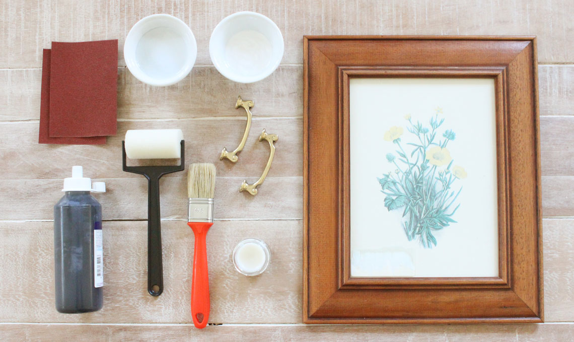 Occorrente: una vecchia cornice (l'importante è che abbia il bordo largo per poter in seguito montare le due maniglie), un pennello piatto, carta a vetro grana 100, due maniglie con relative viti, cera neutra, acrilico all'acqua, aggrappante per metallo, pittura effetto lavagna, rullo piccolo, trapano, righello, matita, colla, gessetto bianco, stracci (uno di cotone e uno di flanella) e guanti.