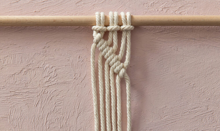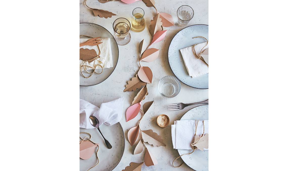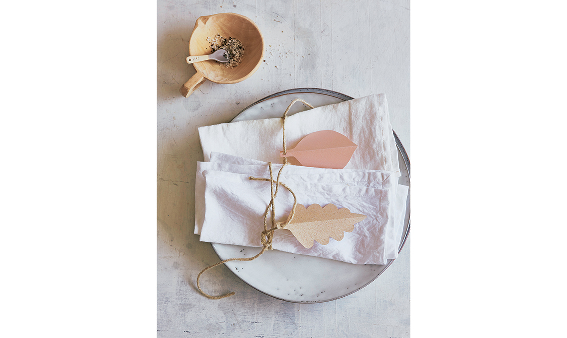 Con un ago da lana realizza un foro sul picciolo delle foglie. Infila uno spago, avvolgilo attorno al tovagliolo con giri morbici e fai un nodino. Aggiungi alcune foglie sagomate per decorare e fissale allo spago.