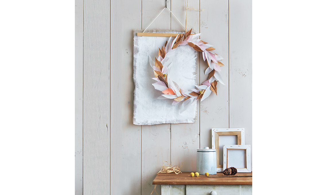 Una pioggia di foglie rosa cipria, beige, fango e tortora sono incollate a correre sullo spago. Anche in questo caso realizza le foglie sagomate aiutandoti con una dima.