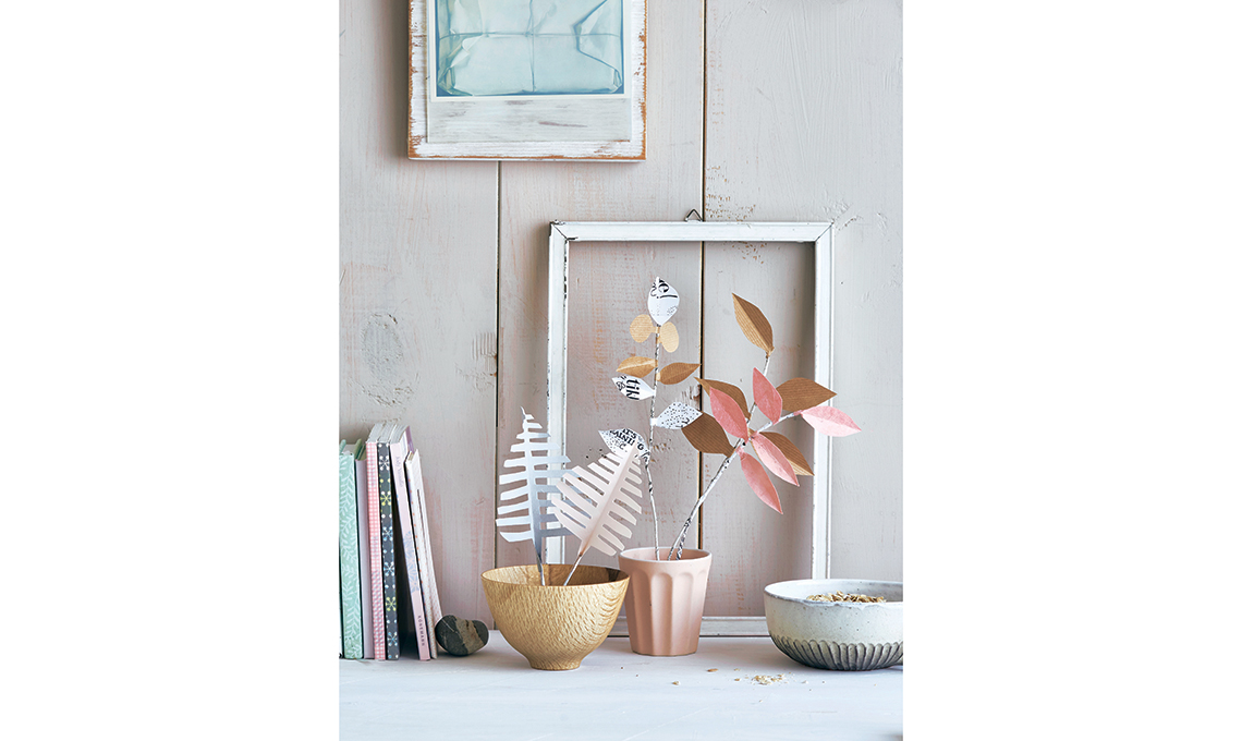 Per il gambo rivesti un filo di ferro con strisce di carta da giornale dello spessore di 1 cm, avvolte in diagonale e fissate con la colla. Dalla carta avana, da giornale e rosa ritaglia foglie di diverse dimensioni e con il picciolo lungo almeno 2 cm. Incolla le foglie a diverse altezze, avvolgendo il picciolo attorno allo stelo.