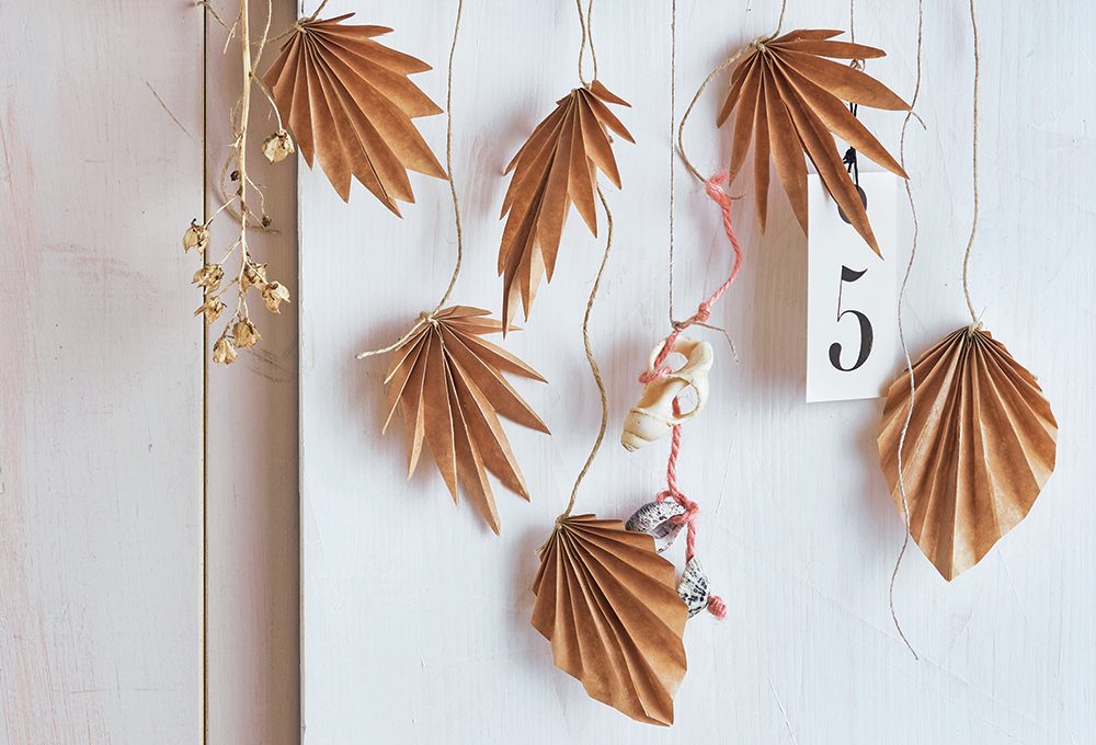 Piega a metà una striscia di carta, appoggia la dima (una sagoma di riferimento) con il lato lungo su quello piegato della carta, traccia il contorno della foglia e ritaglia.