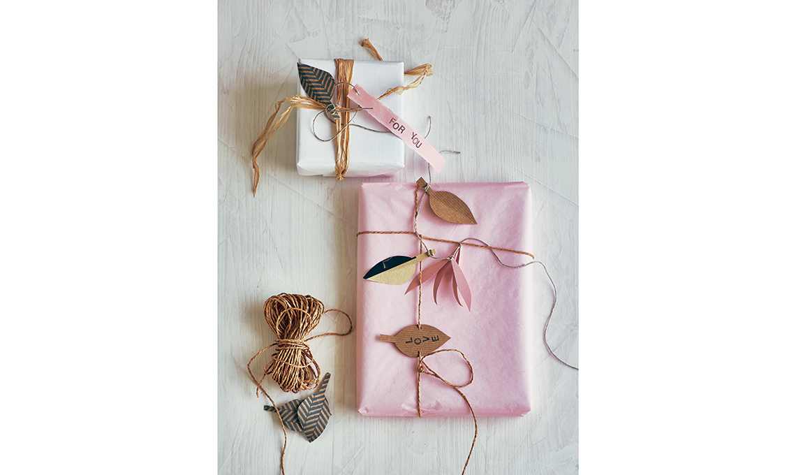 Con i timbri scrivi il nome su una foglia, realizza due fori e infilala nello spago. Decora il pacchetto con altre foglie. Per dare movimento puoi creare e aggiungere alcune foglie sagomate e piegarle a metà (nel senso della lunghezza).