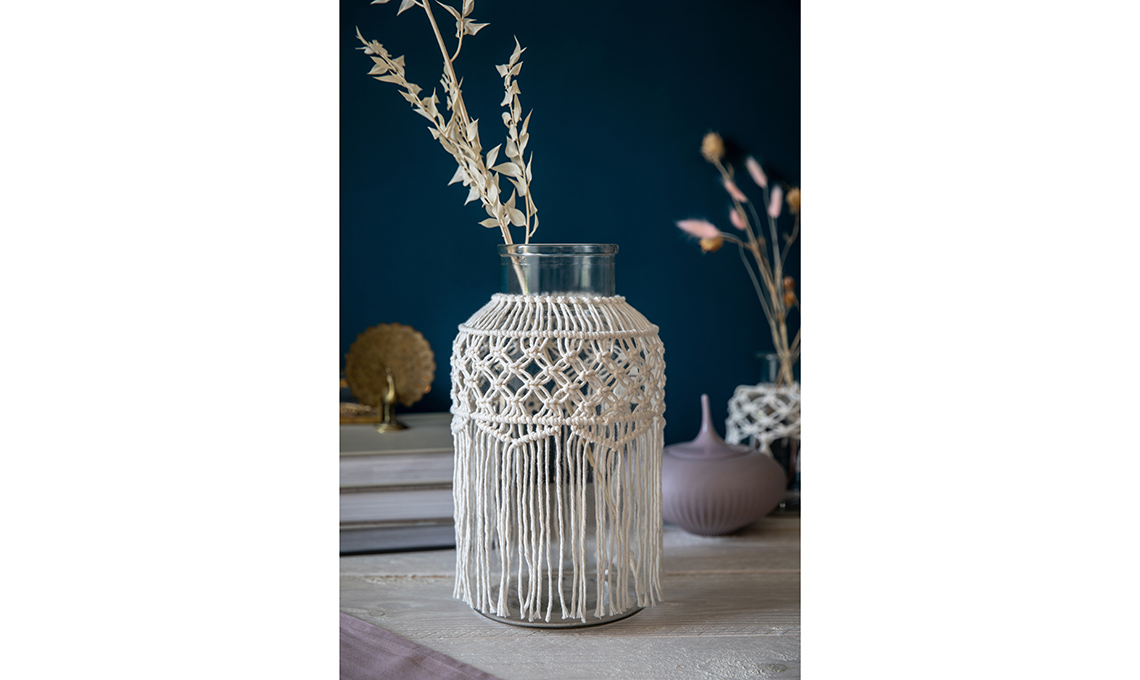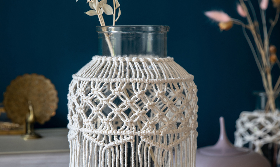 Il nome macramè deriva dall’unione delle parole arabe ’frangia’ e ’nodo’ e indicava gli ornamenti creati dai marinai durante le lunghe traversate in mare, intrecciando e annodando a mano una serie di fili verticali. Scopri come realizzare la cover per il vaso.