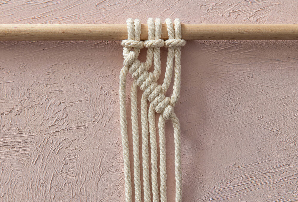 - Prosegui per altri 4 giri con la tecnica del nodo piatto alternato: non lavorare i primi 2 fili. Prendi i successivi 4 fili per fare il nodo piatto, poi i successivi 4 fili per il secondo nodo piatto e cosi via fino al termine dei fili. Gli ultimi due fili non vengono lavorati, come i primi due all’inizio.