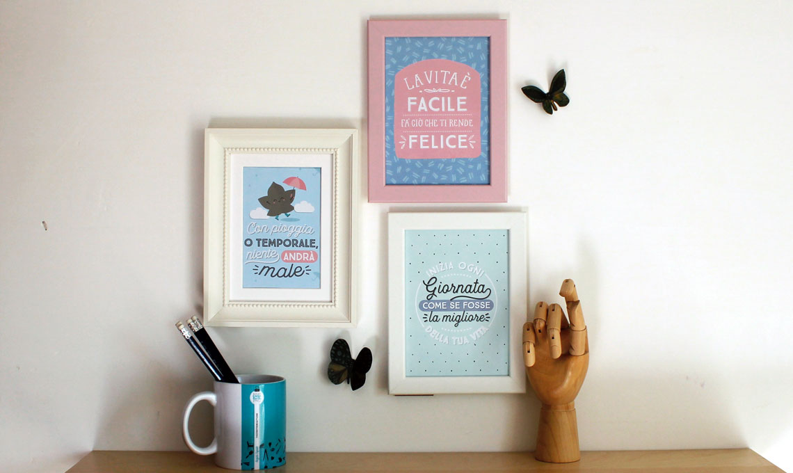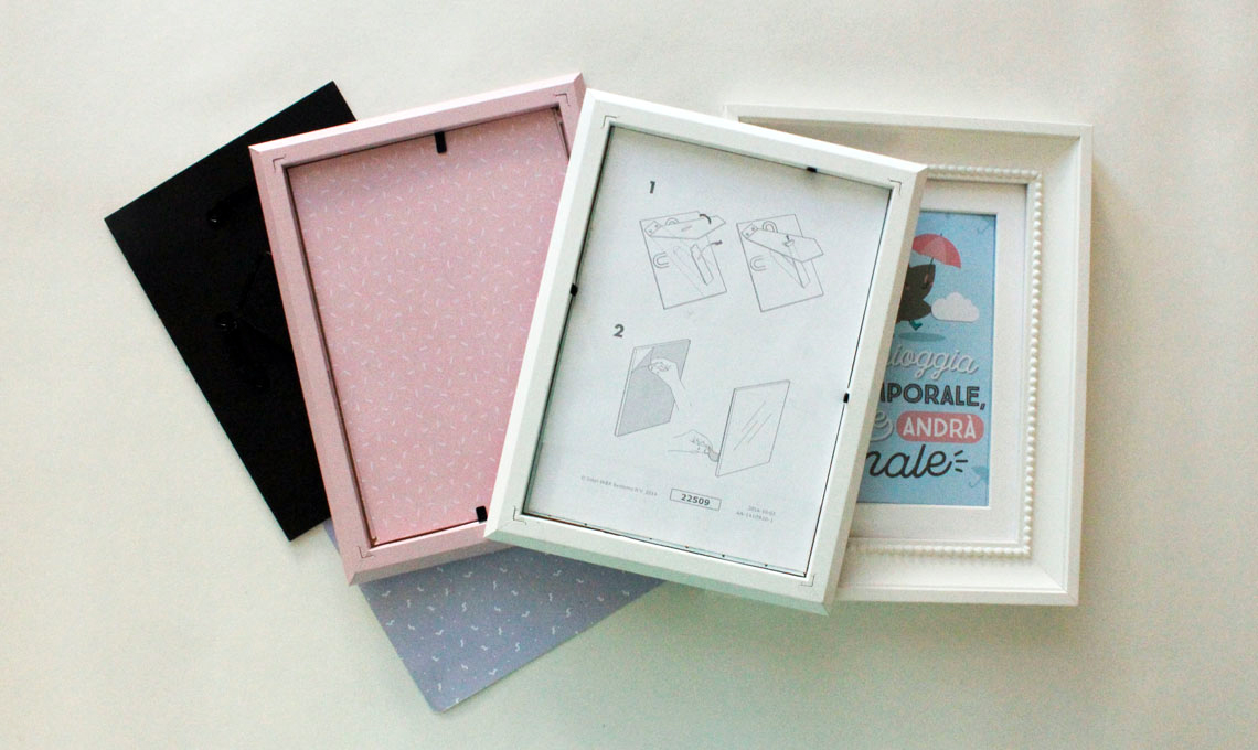 - Inizia ad incorniciare, avendo cura di creare armonia tra i colori delle pagine, quelli della parete e le tue cornici. Fai qualche prova abbinando forme e colori, poi passa alla fase successiva.