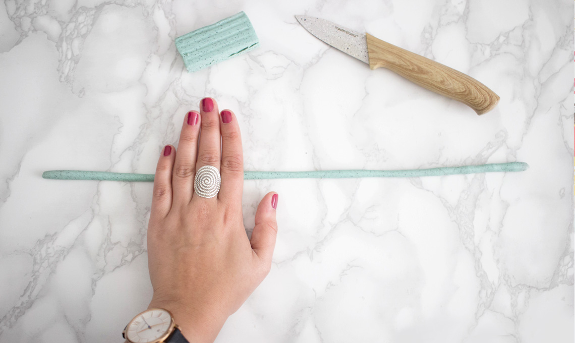 - Tagliare un pezzetto di fimo e iniziare ad ammorbidirlo, lavorandolo con le mani. Arrotolare il fimo fino ad ottenere una serpentina;
