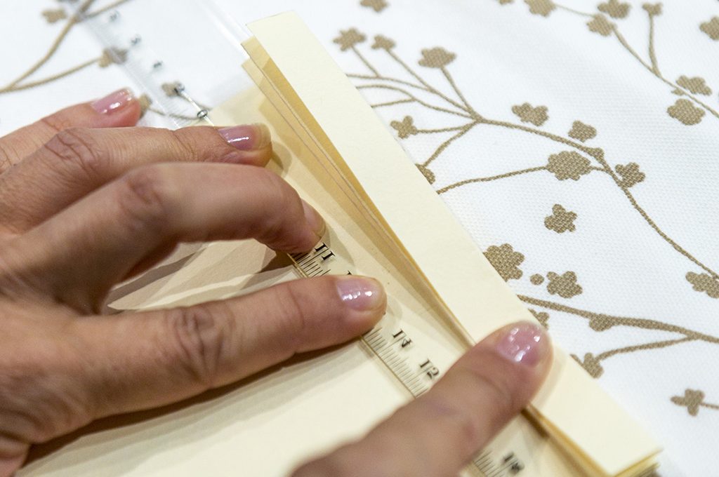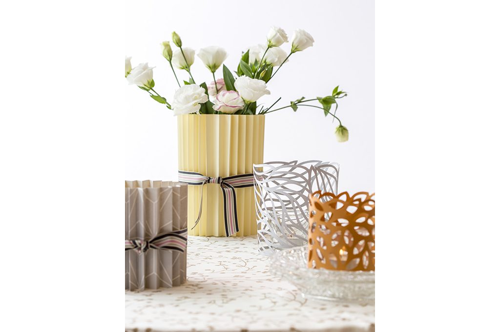 Con il righello piega a fisarmonica un cartoncino e, con un bel nastro, avvolgilo a cilindro attorno a un vaso o al portacandele.