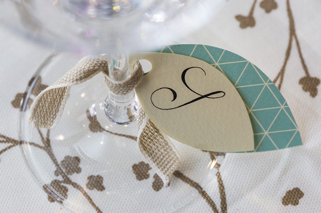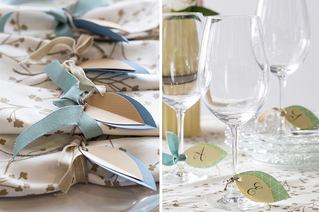 L'idea in più: scrivi sulla foglia l'iniziale dell'invitato e lega le foglie allo stelo del bicchiere con lo spago.