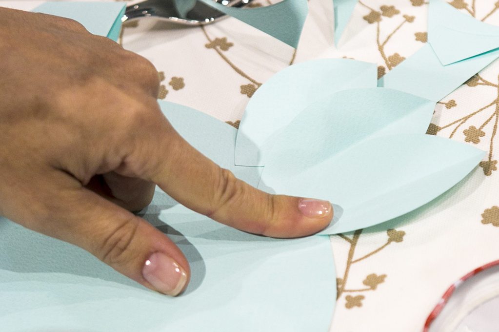 Disegna su un rettangolo di cartoncino tante foglie e intagliale con il cutter. Sagoma la parte alta e chiudi il cartoncino con della colla.